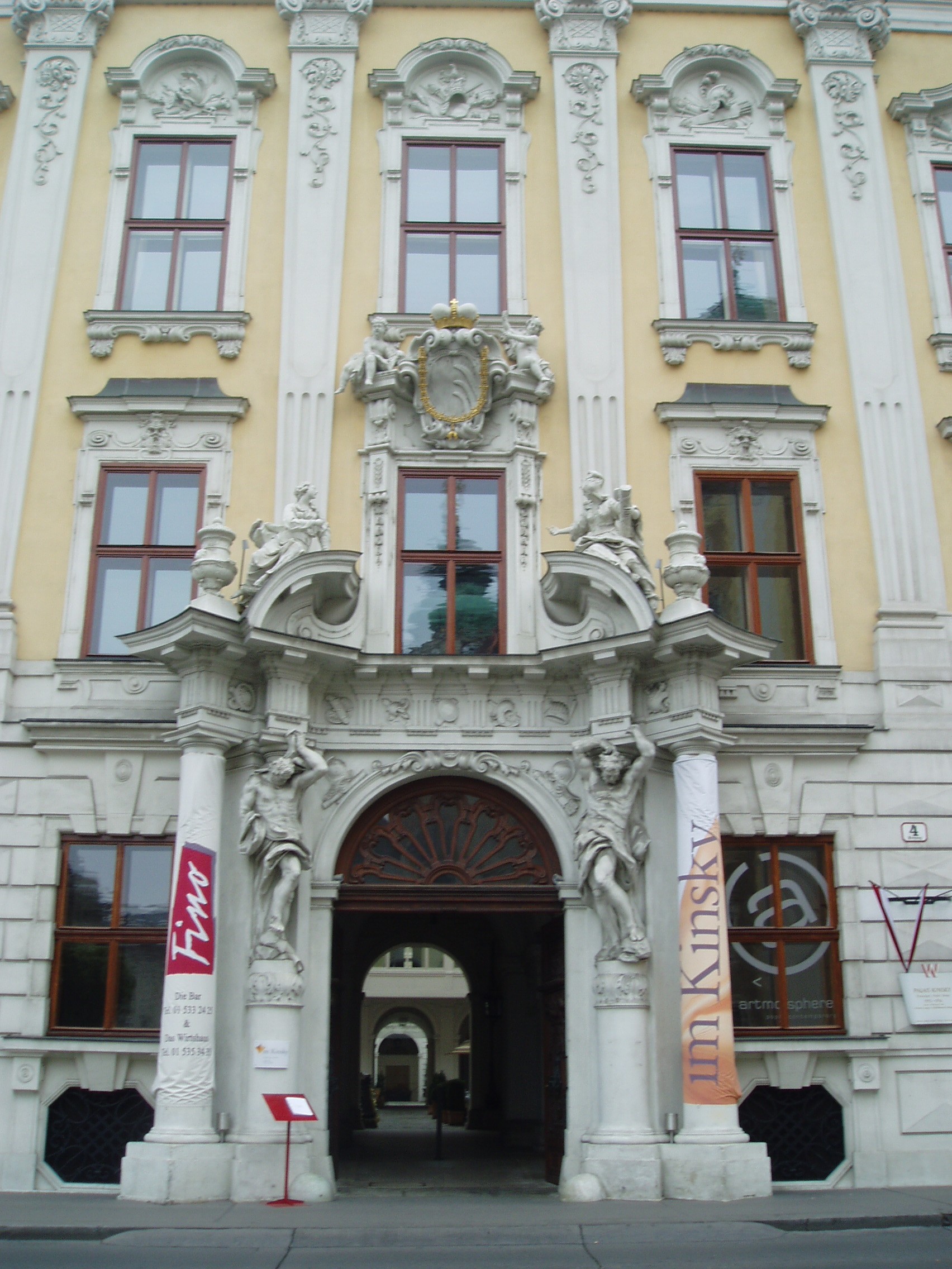 Nyilvános 1555 | 3580 | Freyung 4. Kinsky-palota | A Kinsky hercegi család városi palotáját 1713-16 között a bécsi barokk építészet Fischer von Erlach mellett másik legkiválóbb mestere, Johann Lucas von Hildebrandt építette át eredetileg annak a Daun grófnak a megbízásából, akinek a fia, Leopold Joseph Daum Mária Terézia egyik hadvezére lett Monumentális szobrok állnak a bejárat két oldalán és a bejárat felett; hasonló méretűek emelkednek magasba a harmadik emeletet szegélyező tetőpárkányon. Ha áthaladunk a bejárati kupolacsarnokon, két nagy belső udvar tárul fe előttünk. Az első udvart a palota barokk szárnyépületei állják körül. A hátsó udvart a palota még későbbi, már klasszicista stílusban emelt szárnyépületei szegélyezik. A lépcsőház a legszebbek egyike Bécsben. Az előcsarnok ovális boltozata fölött az első emeleten ovális alaprajzú a díszterem is, mennyezetén Carlo Carlone freskójával. Az első emeleti szalon mennyezetén négy kör alakú festményt helyeztek el, amelyek a művészetek szimbólumait jelenítik meg. Amikor Kinsky Ferdinand herceg volt e palota ura, Beethoven zenetanárként kezdett bejáratos lenni a házhoz; később a fényes estélyek vendégeit zongoravirtuózként és saját szerzeményei előadójaként is megnyerte művészetének. Midőn 1809-ben azzal a gondolattal foglalkozott, hogy elhagyja Bécset és Kasselbe megy, Kinsky herceg kezdeményezésére Rudolf főherceg és Lobkowitz herceg közösen életjáradékot biztosítottak a művésznek (ezen belül Kinsky adta a nagyobb összeget); a herceg feleségének, akiről Beethoven azt mondta, hogy „Bécs legcsinosabb és legkövérebb asszonya”, három, Goethe-versekre írt dalát ajánlotta a mester. |