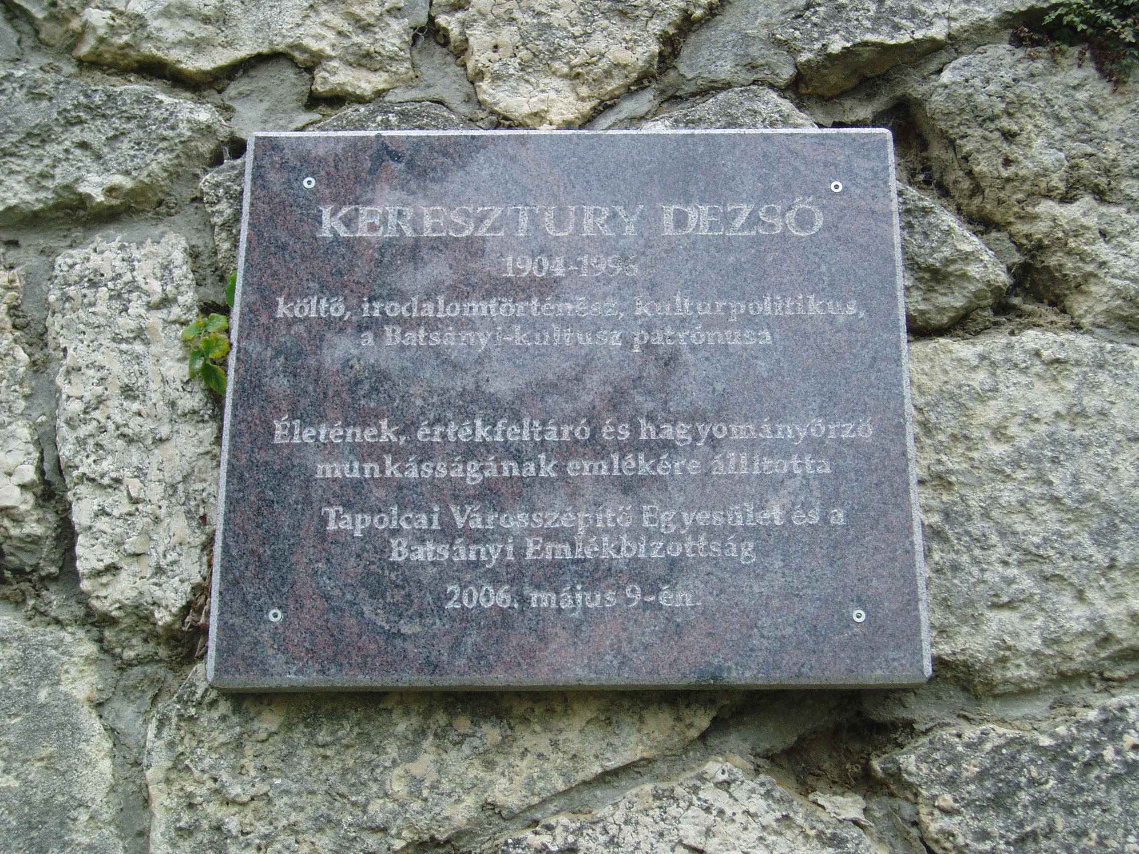 Nyilvános 1037 | 1796 | Tapolca, Városi Panteonfal: Keresztury Dezső emléktáblája | A Malom-tó mögött álló magas kőfal a Városi Panteonfal, amelyen több neves, tapolcai kötődésű személyiségnek állítottak emléktáblát. A képen Keresztury Dezső (1904-1996) költő, író, irodalomtörténész 2006-ban felavatott emléktáblája látható. Keresztury sokat tett a tapolcai születésű nagy költő, Batsányi János kultuszáért. A felvétel 2007 februárjában készült. Felh. irod.: Bándi László: Emlékhelyek Veszprém megyében. Veszprém, 1996 www.tapolca.hu |