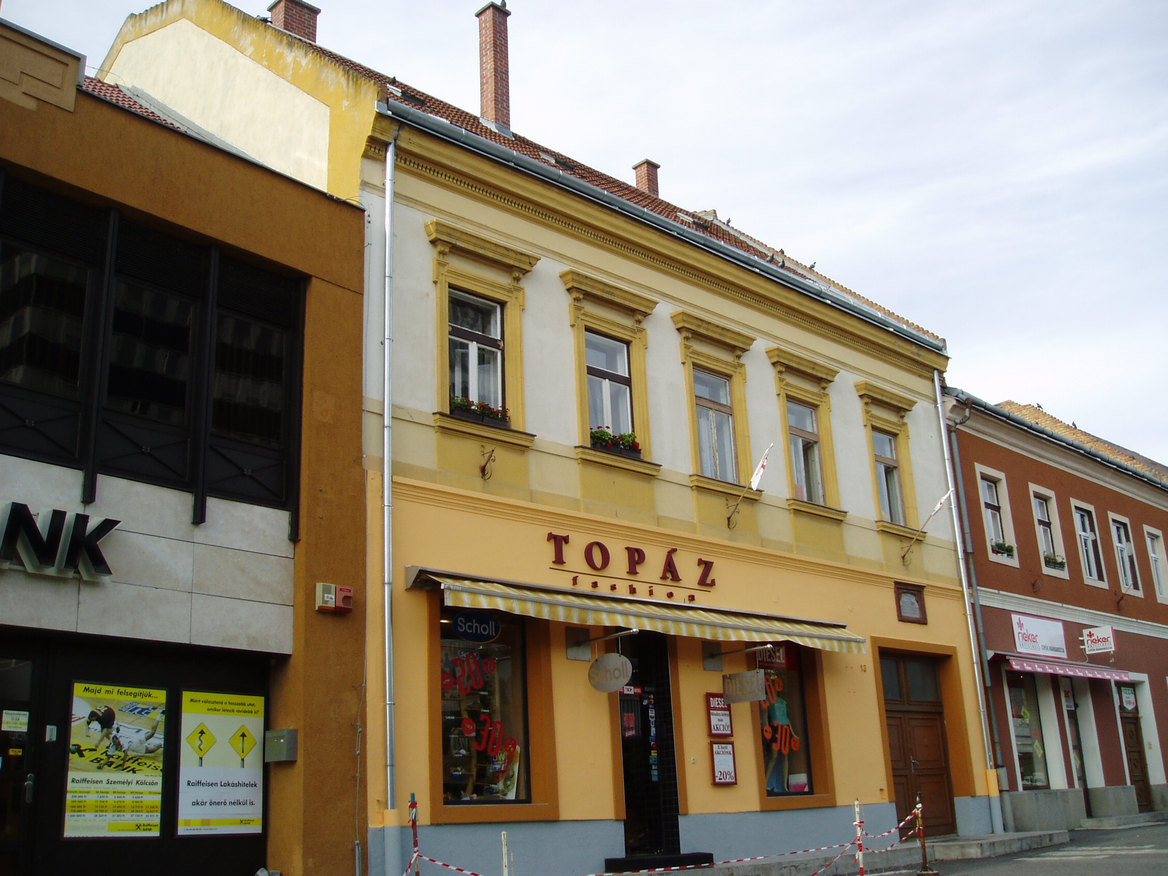 Nyilvános 1107 | 2902 | Veszprém: Kossuth utca 13. | A Kossuth utca Veszprém belvárosának kereskedelmi főutcája. A 13. számú historizáló épületen emléktábla hirdeti, hogy 1831-ben itt született Szigeti Imre (1831-1902) színész. 1856-ban Pécsett lépett először színpadra. Egy év múlva a kolozsvári színházhoz szegődött, 1860-tól pedig a győri színház igazgatója. Közel nyolc évig járt társulatával vidéki városokban, köztük Pápán is. 1868-ban a Nemzeti Színház szerződtette. A nemzeti színházművészet úttörő gárdájának egyik vezető tagja, a Nemzeti Színház nyugdíjintézetének több évig alelnöke volt. Jellemszínészként főként humoros alakokat elevenített meg. A felvétel 2005 augusztusában készült. Felh. irod.: Veszprém megyei életrajzi lexikon. Veszprém, Veszprém Megyei Önkormányzat Közgyűlése, 1998 |