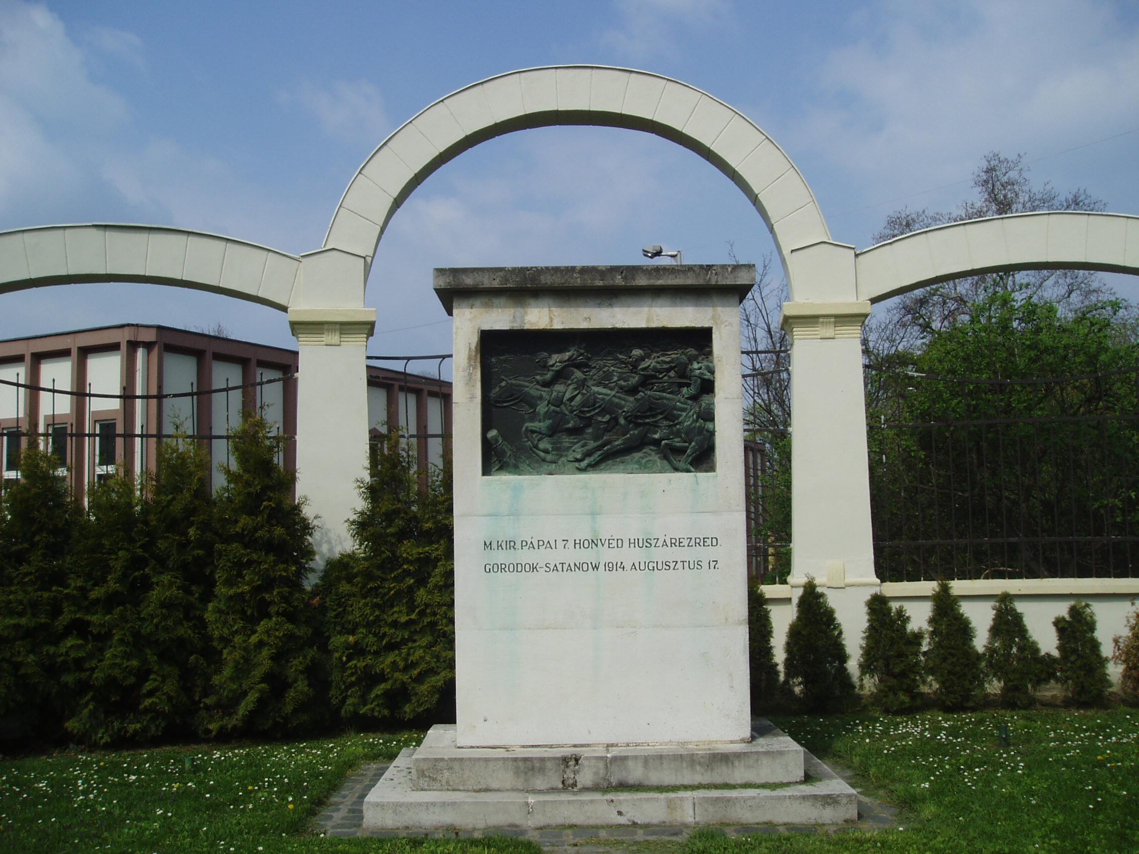 Nyilvános 1104 | 2157 | Pápa, Esterházy út: a pápai 7-es huszárok emlékműve | Az Esterházy-kastély közelében, a színház irányában áll a pápai 7-es huszárezred emlékműve. Manno Miltiades domborműve az első világháború egyik hadvezetési baklövéseként bekövetkezett tragédiát idézi: az ezred elpusztult Galíciában. A fénykép 2007 áprilisában készült. Felh. irod.: Pápa. Szerk.: Sz. Farkas Aranka. Bp., Magyar Képek, 2000 |