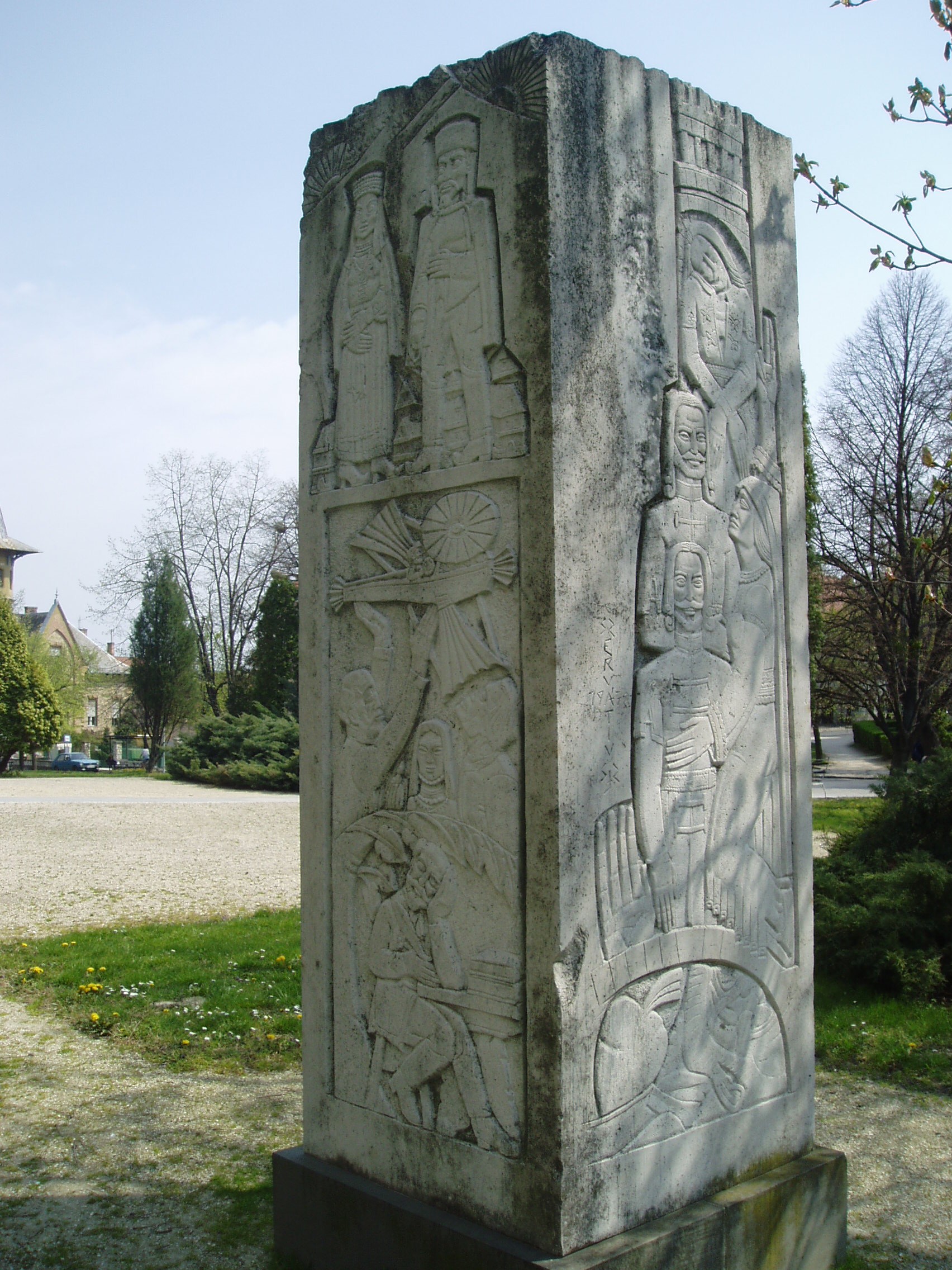 Nyilvános 1086 | 1645 | Pápa, Fő tér 1-3. Jókai-oszlop | Az Esterházy kastély előtti, a Fő tér felé néző parkban két egykori pápai diák - Jókai Mór és Petőfi Sándor - emlékére állított szoborkompozíció áll. Jókai Mór emlékoszlopa Szervátiusz Jenő és Szervátiusz Tibor alkotása. A négyzetes hasáb alakú mű felületét Jókai Mór és regényalakjainak domborműves ábrázolásai borítják. A fénykép 2007 áprilisában készült. Felh. irod.: Németh Adél - Szabó Lajos: Pápa. Bp. Panoráma, 1989 |