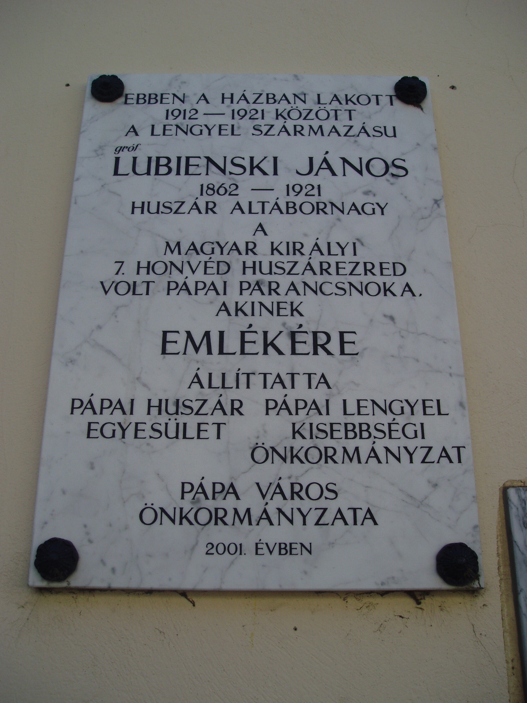 Nyilvános 1064 | 1891 | Pápa, Fő tér 21. Zichy-ház | A saroképület Korvin utca felőli oldalon 2001-ben helyezték el gróf Lubienski János (1862-1921) lengyel származású huszár altábornagy emléktábláját, aki a 7. Honvéd Huszárezred pápai parancsnoka volt, s 1912-1921 között ebben a házban lakott. Életéről és tevékenységéről Fejes Sándor írt monográfiát (Gróf Lubienski János huszár altábornagy 1862-1921. Pápa, Pápai Lengyel Kisebbségi Önkormányzat, 2002). A fénykép 2007 áprilisában készült. |