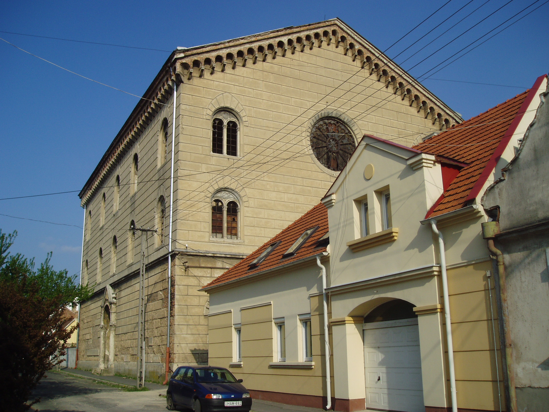 Nyilvános 1123 | 3000 | Pápa, Petőfi utca 21. Zsinagóga | A napjainkig eredeti formában fennmaradt zsinagóga építését 1844-ben kezdték el. A 398 m2 alapterületű, közel 20 méter magas épületet Löw Lipót rabbi szentelte fel 1846-ban. A főbejárat a vallási előírásoknak megfelelően a nyugati oldalon található. A zsinagóga puritán külső megjelenését csak a félköríves fülkékbe helyezett romantikus ikerablakok és a klasszicizáló oldalkijárat díszíti. A kétszintes karzatszerkezettel rendelkező, dekoratívan festett belső térben nyolcszáz férfi számára volt ülőhely. Az épület jelenleg (2007) rendkívül elhanyagolt állapotban van, felújításra vár. A fénykép 2007 áprilisában készült. Felh. irod.: Németh Adél - Szabó Lajos: Pápa. Bp. Panoráma, 1989 www.papa.hu |