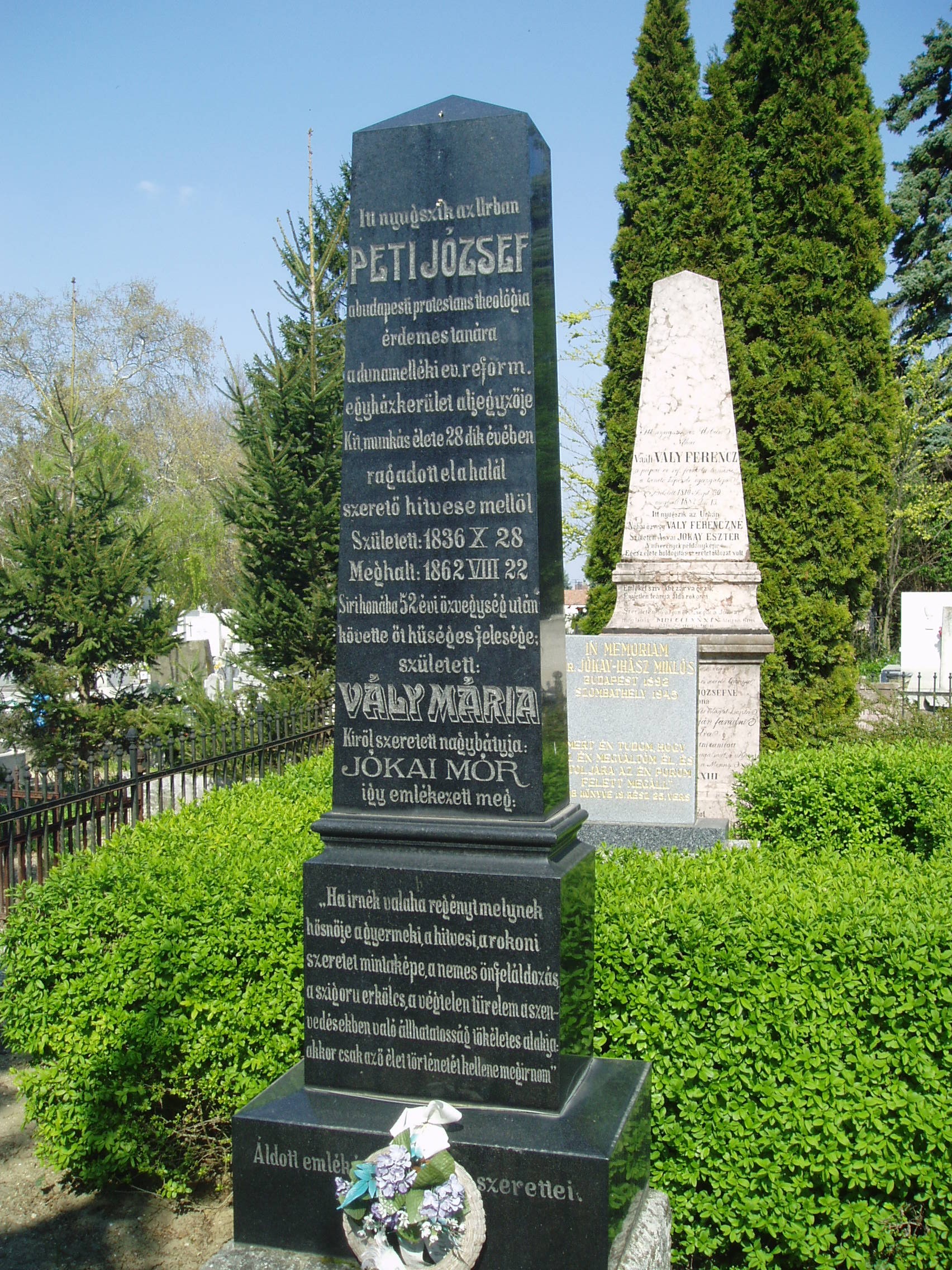 Nyilvános 1330 | 3611 | Pápa, Alsóvárosi temető: Vály Mari sírja | A Jókai utcáról nyíló Temető utca vezet a XIX. század elején megnyílt Alsóvárosi köztemetőbe. A város sok neves személyiségének van itt a sírja. Itt nyugszik Vály Mari (Komárom, 1840. nov. 17. – Pápa, 1915. máj. 17.) emlékiratíró, Jókai Mór unokahúga (Eszter nővérének lánya, apja Vály Ferenc tanár). Férjének és gyermekének korai halála után Jókaiékhoz költözött, háztartásuk vezetésében segédkezett. Nagybátyja életét terjedelmes emlékiratban örökítette meg, amelyből szemelvényes kiadásban jelent meg: Emlékeim Jókai Mórról címmel csak részletek jelentek meg 1955-ben. Sírkövén nagybátyjának sorai olvashatók. Ugyanitt nyugszik férje, Peti József (Komlósd, 1831. okt. 24. – Pest, 1862. aug. 22.) tanár. Tanulmányait Csurgón kezdte, 1850-től Pápán, Bécsben és Bazelben folytatta, ahol teológiát is hallgatott. A pápai gimnáziumban 1856-ban, egy év múlva Kecskeméten, 1859-től Pesten a teológia tanára. A Duna-melléki Egyházkerület 1861-ben aljegyzővé választotta. Több tudományos értekezést írt, melyek a tiszántúli egyházi folyóiratokban és évkönyvekben jelentek meg. A fénykép 2007 áprilisában készült. Felh. irod.: Németh Adél - Szabó Lajos: Pápa. Bp. Panoráma, 1989 Veszprém megyei életrajzi lexikon. Veszprém, Veszprém Megyei Önkormányzat Közgyűlése, 1998 |