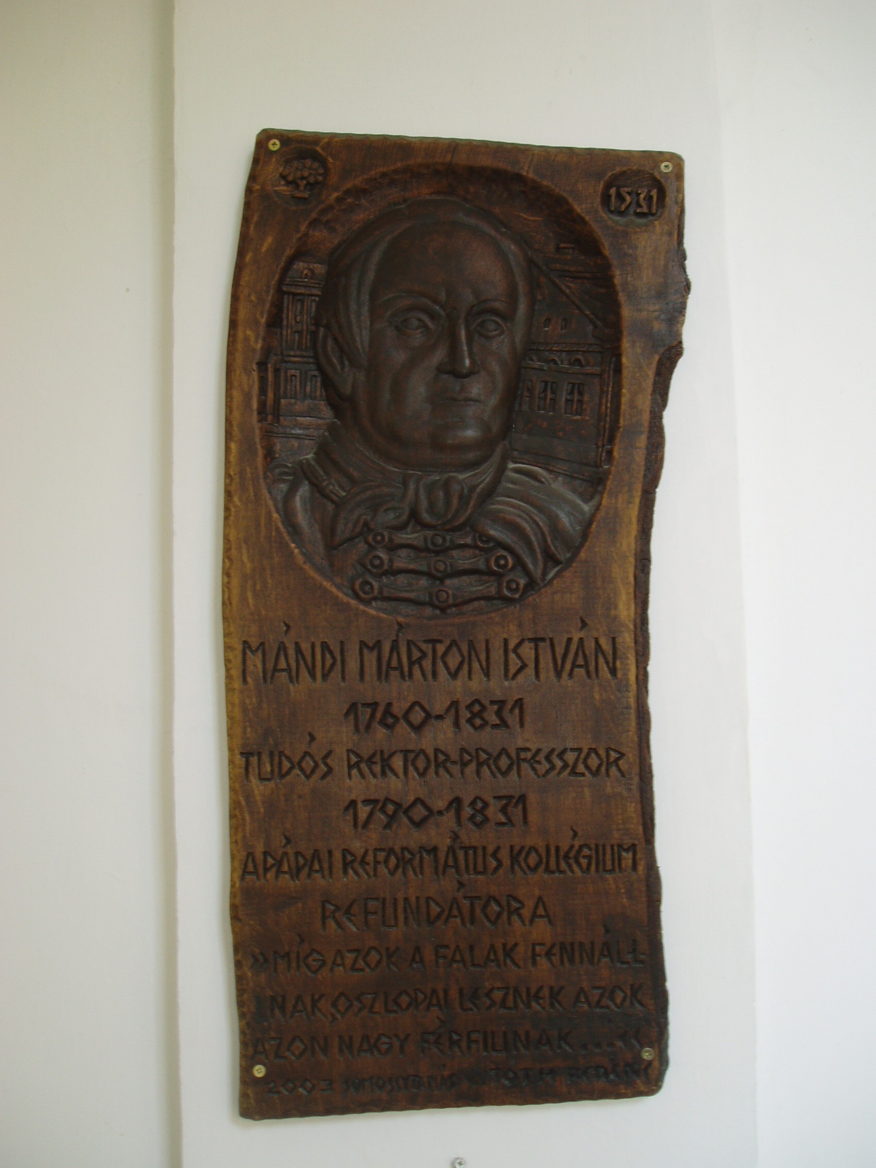 Nyilvános 1018 | 1664 | Pápa, Március 15. tér 9. Pápai Református Kollégium Gimnáziuma | A híres pápai Református Kollégium első épülete 1531 és 1752 között a mai Ruszek közben, a Lábasház épületének helyén állott. 1752-ben - Mária Terézia rendeletének következtében, amely megszüntette a szabad vallásgyakorlást - harminckét évig csak a közeli Adásztevelen működhetett. 1784-ben, II. József türelmi rendeletének köszönhetően térhetett vissza az iskola Pápára, s hamarosan felépült a ma Ókollégiumként ismert épület (lásd: Pápa, Petőfi u. 13.), amelyben 1794-ben indulhatott meg az oktatás. Az intézmény 1857-ig működött ott, ekkor átköltözött a Március 15. tér 13-15. számú házba, az ún. Nátus-ba, majd 1895-ben utolsó végleles helyére, ide, a Március 15. tér 9. számú monumentális új épületbe. Az iskola folyosóin számtalan emléktábla, szobor, dombormű idézi az egykori kiváló tanárok, jeles diákok alakját. A képen Mándi Márton István fa reliefje látható, amely Somosi Tamás munkája. Mándi Márton István (Iszkaszentgyörgy, 1760. nov. 23. – Pápa, 1831. szept. 21.) nyelvész, tanár, filozófus. Kecskeméten, Debrecenben, majd Göttingában tanult. 1790-től volt a pápai református gimnázium rektor-professzora. Nevéhez fűződik az iskola új fellendülése. A filozófiában Kant követője volt és 1795-ben már Kant tanítása alapján tartott előadásokat, amelyekért súlyos bírálat érte. Síremléke az Alsóvárosi temetőben van (lásd: Pápa, Alsóvárosi temető,: Mándi Márton István sírja); márvány mellszobra, Izsó Miklós alkotása a református könyvtárban látható. A fénykép 2007 áprilisában készült. Felh. irod.: Németh Adél - Szabó Lajos: Pápa. Bp. Panoráma, 1989 http://refi-papa.hu |