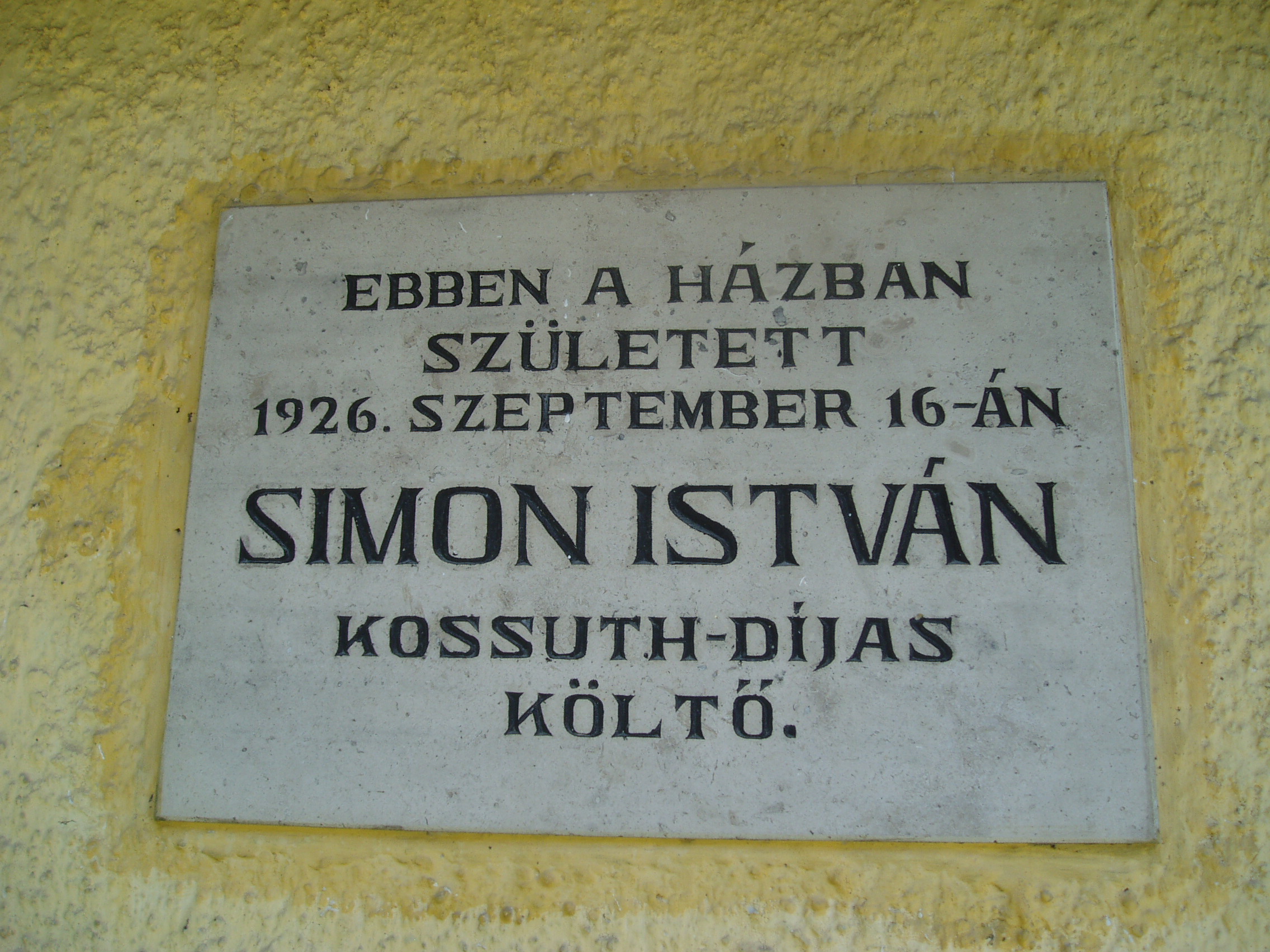 Nyilvános 1307 | 2811 | Bazsi, Fő út 149. | 1926. szeptember 16-án itt, az udvari házrészben született Simon István költő. A kis épületet 1983. április 11-én, a költészet napján, országos ünnepség keretében avatták emlékházzá. Benne ma is a költő szüleinek eredeti bútorai és tárgyai láthatók, Simon Istvánról szóló dokumentációval kiegészítve. Simon István tizennyolc éves koráig élt Bazsiban. A sümegi gimnáziumot bejáró diákként végezte el. 1948-tól Budapesten lakott, de gyakran hazajárt szülőfalujába. Számos, ebben a házban készült fényképen látható idős szüleivel a már nagy elismertséget elért költő. 1975 nyarán nagybetegen került a sümegi kórházba, ahol július 6-án elhunyt. Kívánságának megfelelően Bazsiban temették el (sírjánál sajnos nem jártam, a temető elég messze van a falutól - K.K.). A szegényparaszti környezet, a szülőföld, a Sümeg környéki táj mindvégig éltető eleme volt költészetének. A fénykép 2007 júniusában készült. Felh. irod.: Erős Zoltán: Magyar irodalmi helynevek A-tól Z-ig. Bp. Kis-Lant Kiadó, 1995 |