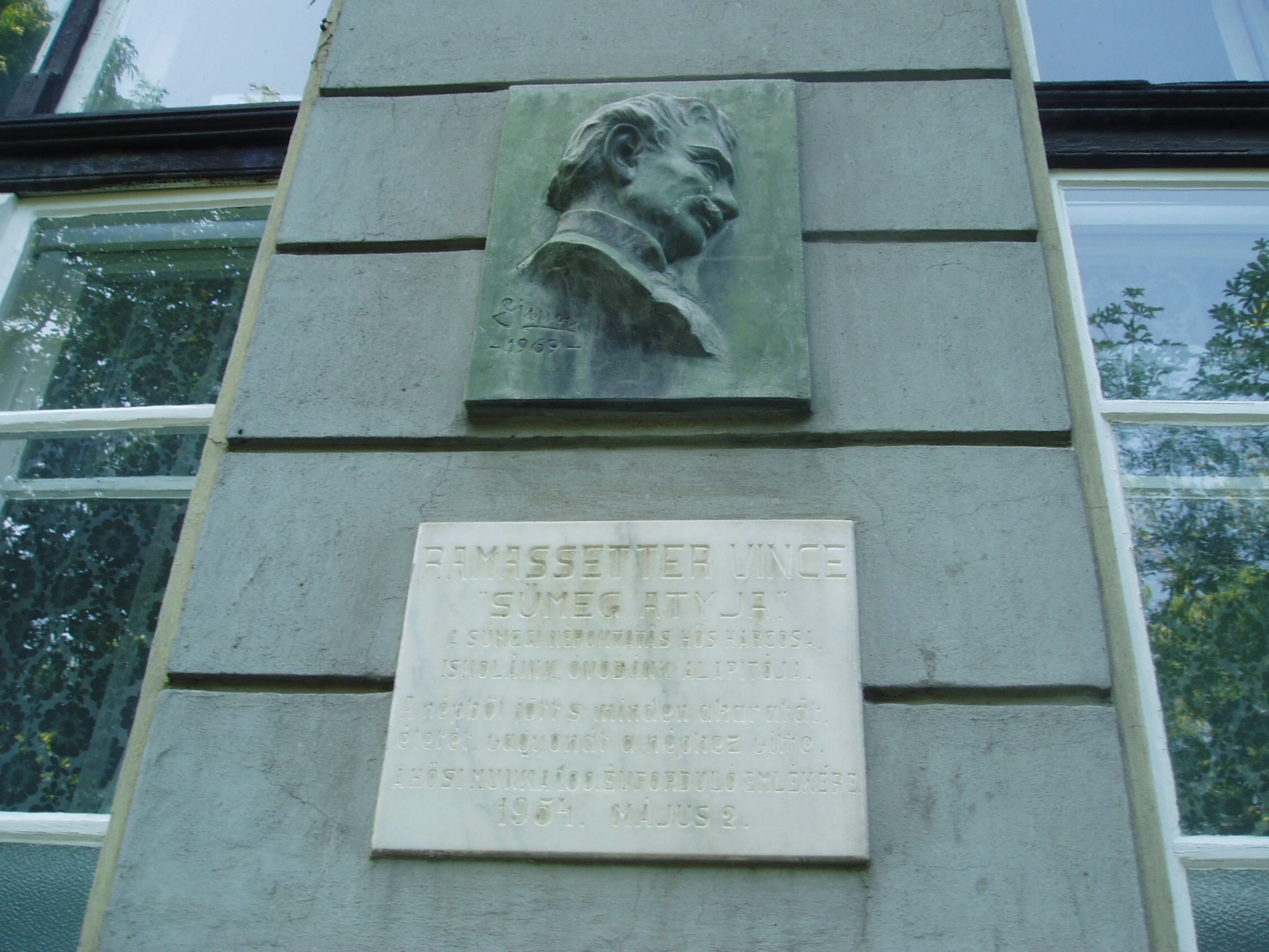 Nyilvános 1028 | 1573 | Sümeg, Árpád utca 5. | A Kisfaludy-Rammassetter Iskola épületén 1954-ben felavatott márványtábla és Simon Béla 1969-ben készült portrédomborműve emlékeztet Sümeg legendás személyiségére, Rammassetter Vincére. "Sümeg atyja" emlékét a városban egészalakos szobor és több emléktábla is őrzi (lásd: Deák F. u. 8., Kossuth u. 13., Mártirok u. 1., Panteonfal, Rammassetter u. 10., Temető). A fénykép 2007 júniusában készült. |