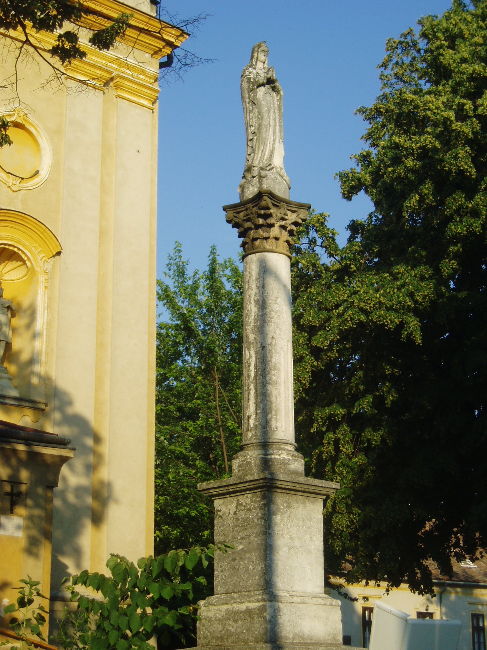 Nyilvános 1040 | 1603 | Sümeg, Bíró Márton utca 1. Plébániatemplom | Sümeg egyik legszebb épülete az Urunk mennybemenetele tiszteletére emelt római katolikus templom. Ezen a helyen már a XIV. században templom állott, melyet Padányi Bíró Márton lebontatott, és 1756-1759 között építtette fel a mai barokk plébániatemplomot. Építészetileg a barokk stílus általános, megszokott mintáit mutatja: nyugati főhomlokzatát hatalmas falpillérek díszítik, fölötte háromrészes főpárkány húzódik, a középrészben az építtető püspök címerével. Az épület igazi értékét Franz Anton Maulbertsch falfestményei jelentik, amelyek az egész templombelsőt beborítják. Nem véletlenül nevezik a templomot a rokokó Sixtus-kápolnájának. A templom előtt Schmidt Krisztián 1750 körül készített Szentháromság-oszlopa látható. A fénykép 2007 júniusában készült. Felh. irod.: Koppány Tibor - Kozák Károly: Sümeg útikalauz. Veszprém, Idegenforgalmi Hivatal, 1965 Látnivalók Veszprém megyében. Miskolc, Well-PRess, 2004 Sümegi kalauz. Sümeg, Sümegi Fórum Alapítvány, 1993 |