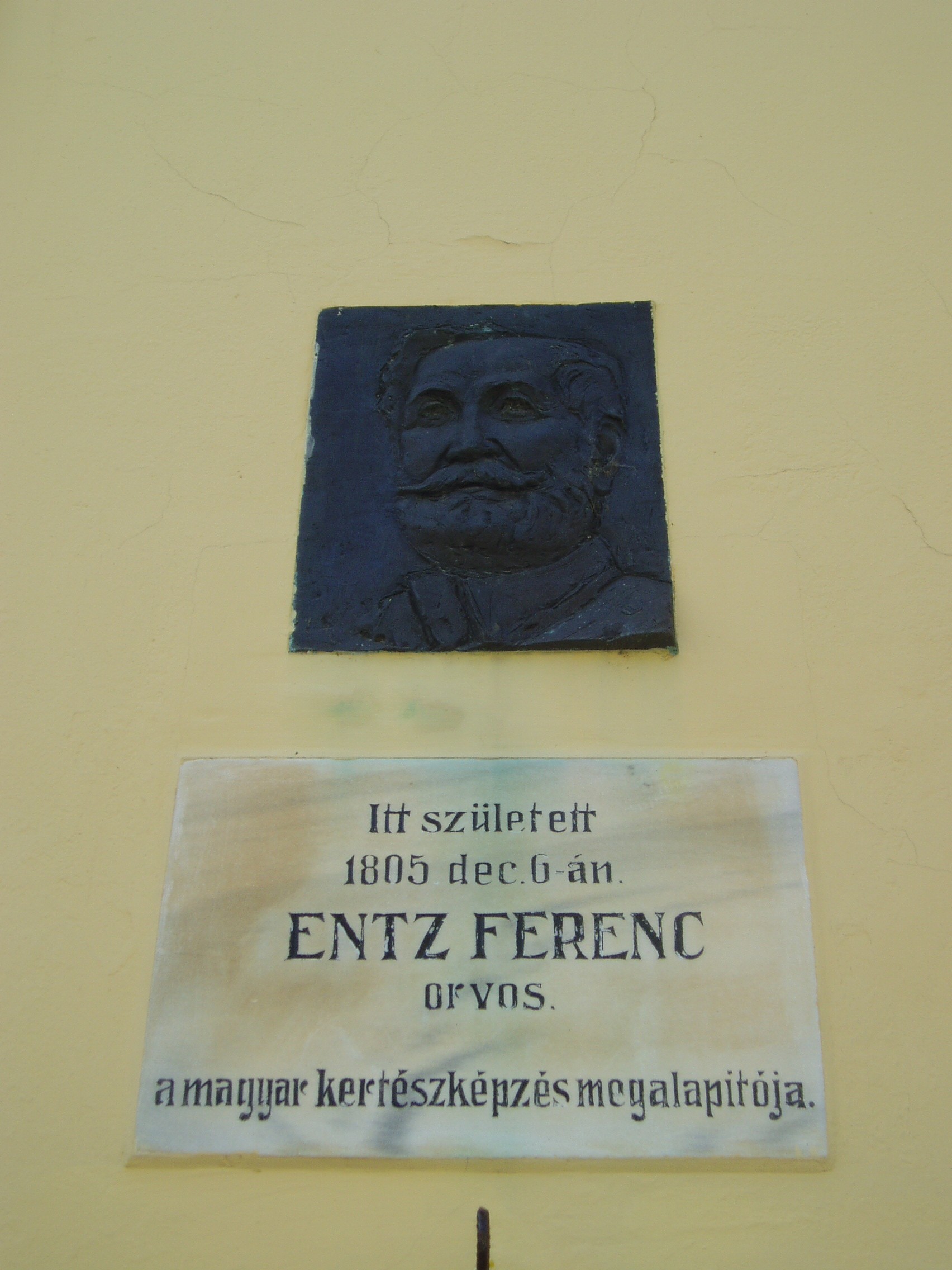 Nyilvános 1016 | 1711 | Sümeg, Ramassetter utca 6. | A Ramasetter utca házai jórészt a XVII. század második felében épültek, bár a legtöbbet később átalakították. A 6. számú ház homlokzatán olvasható emléktábla szerint itt született Entz Ferenc. Entz Ferenc (Sümeg, 1805. dec. 6. – Promontor–Budafok, 1877. máj. 8.) orvos, szőlész, kertész. A szabadságharcban honvéd főorvos volt, ezért Világos után eltiltották az orvosi tevékenységtől. Ekkor fordult a kertészet és szőlészet elméleti és gyakorlati kérdései felé. Megírta korának alapvető kertészeti szakkönyvét. Nagy érdeme a kertészeti műnyelv kialakítása, amelyre a mai kertészeti szaknyelv is épül. 1853-ban Pesten létrehozta az első magyar kertészképző iskolát. Édespja a város köztemetőjében nyugszik (lásd: Sümeg, Temető: Entz Ferenc sírja). A fénykép 2007 júniusában készült. Felh. irod.: Koppány Tibor - Kozák Károly: Sümeg útikalauz. Veszprém, Idegenforgalmi Hivatal, 1965 Veszprém megyei életrajzi lexikon. Veszprém, Veszprém Megyei Önkormányzat Közgyűlése, 1998 www.ekmk.hu/emlekhely/Emlekhelyek.html |