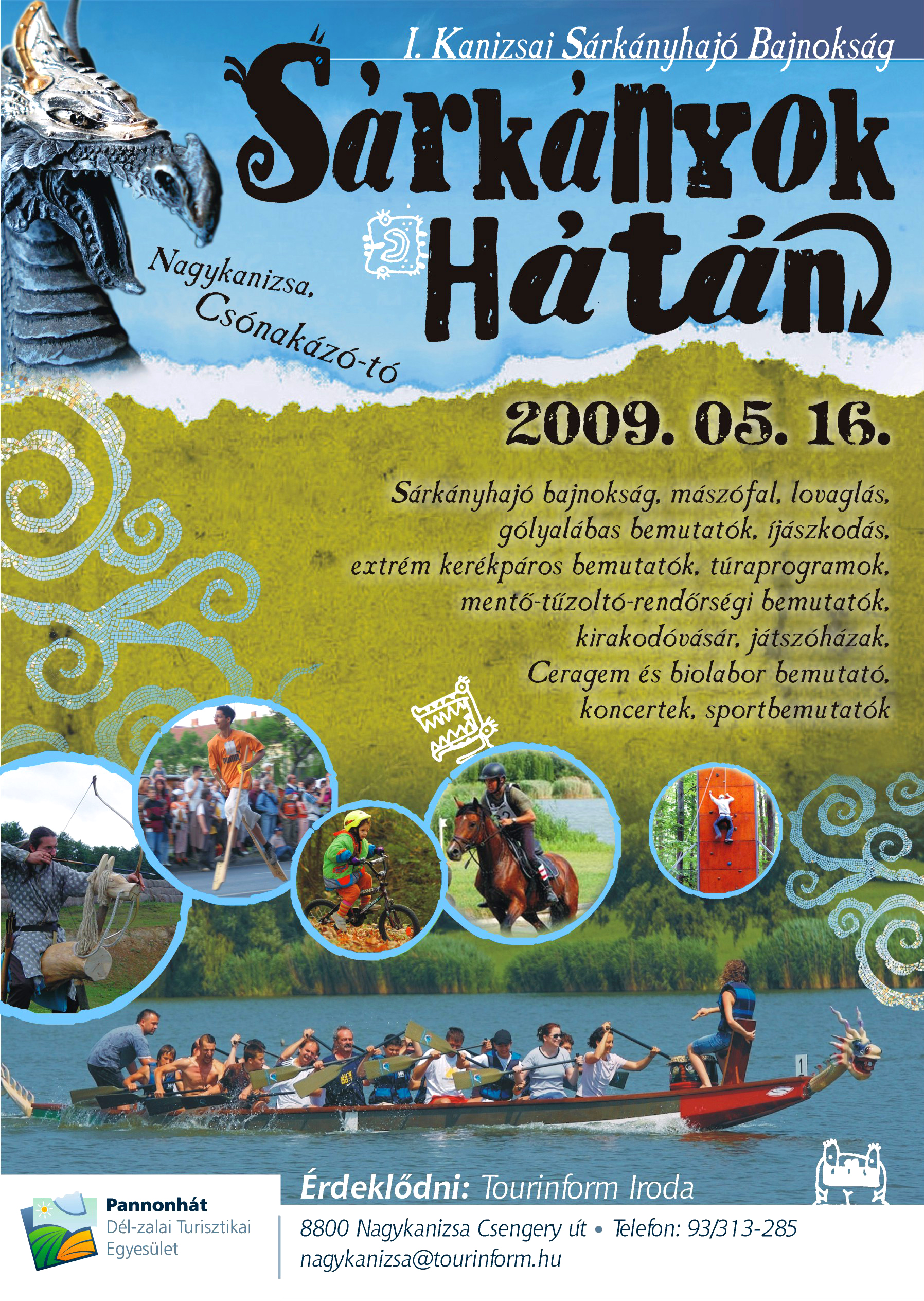 Nyilvános 1586 | 3486 | Sárkányok hátán | I. Kanizsai Sárkányhajó Bajnokság Nagykanizsa, Csónakázó-tó 2009.05.16. Sárkányhajó bajnokság, mászófal, lovaglás, gólyalábas bemutatók, íjászkodás, extrém kerékpáros bemutatók, túraprogramok, mentő-tűzoltó-rendőrségi bemutatók, kirakodóvásár, játszóházak, Ceragem és biolabor bemutató, koncertek, sportbemutatók Szervező: Pannonhát - Dél-zalai Turisztikai Egyesület Érdeklődni: Tourinform Iroda 8800 Nagykanizsa, Csengery út Tel: 93/313-285 Email: nagykanizsa@tourinform.hu |