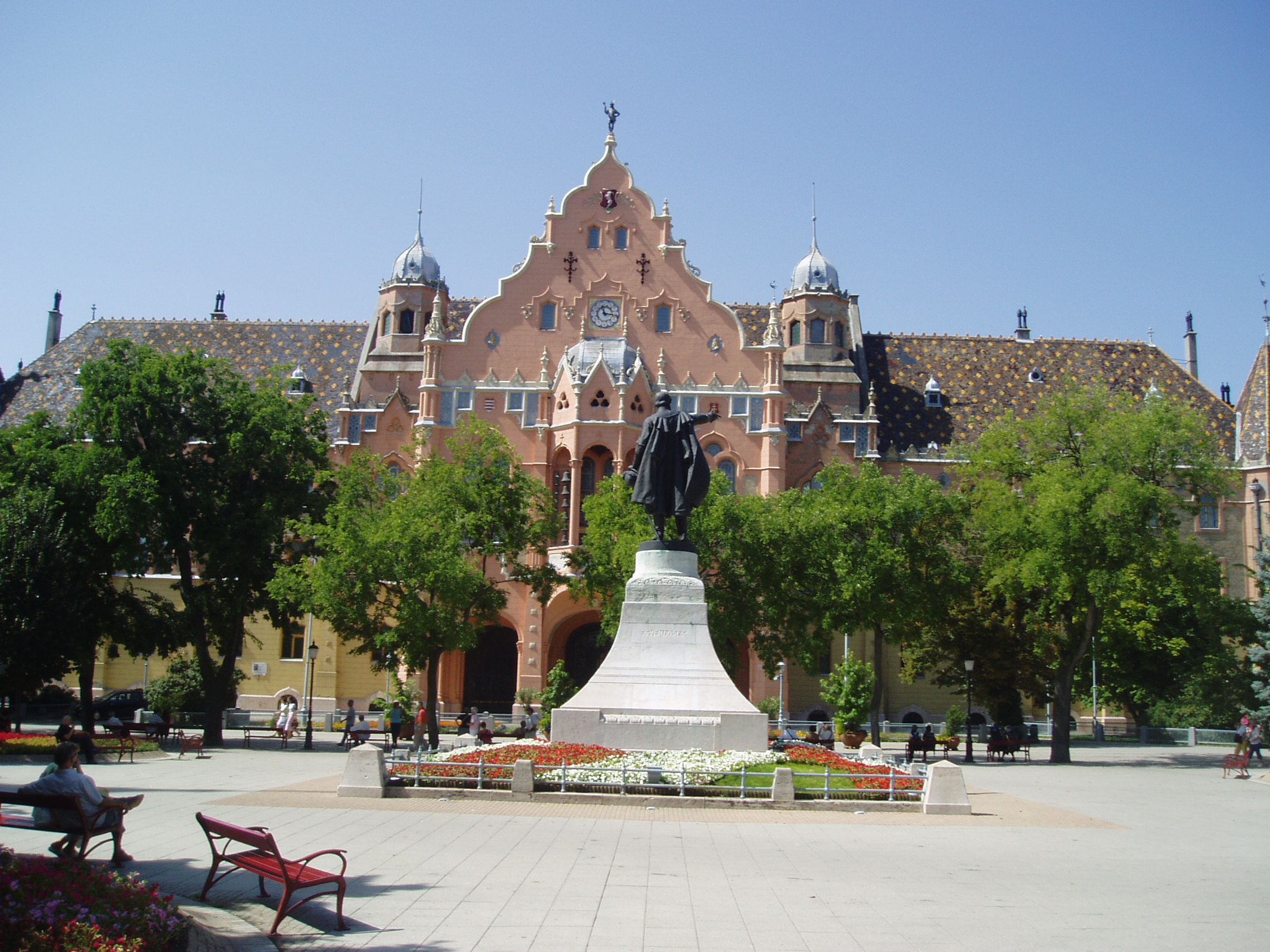Nyilvános 1109 | 1950 | Kecskemét, Kossuth tér 1. | A szecessziós stílusú városháza 1892-1896 között épült Lechner Ödön és Pártos Gyula tervei szerint. A külső majolikadíszek a Zsolnay-gyárban készültek. Pompázatos közgyűlési termében Székely Bertalan freskói láthatók. A fénykép 2006 augusztusában készült. Felh. irod.: Heltai Nándor: Kecskemét. Kecskeméti Lapok, 1998 |