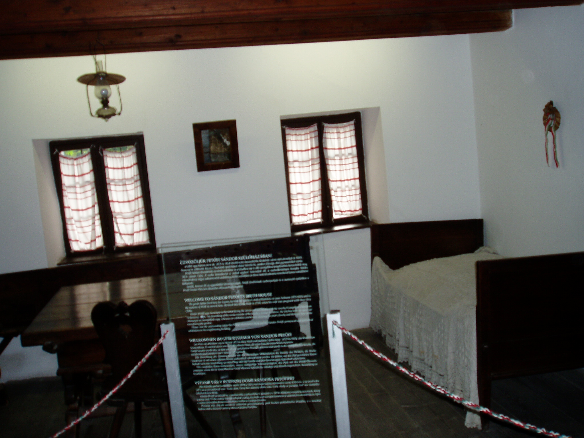 Nyilvános 1134 | 2360 | Kiskőrös, Petőfi tér 5. Petőfi Sándor szülőháza | A népi stílusú lakóház 1790 körül épült. A nádfedeles, deszkaoromzatú, már nem új házat Petrovics István hentes és mészáros 1821-ben vette bérbe, s felesége, Hrúz Mária itt szülte első gyermeküket, Sándort. Az 1790 körül épült zsellérházban kapott helyet a Petőfi Emlékmúzeum. A ház homlokzati márványtábláján ez olvasható: "Itt született Petőfi 1822. december 31-én". A bejárati ajtó szemöldökfája felett a költő sorait olvashatjuk: "Szent a küszöb, melyen beléptem én, / Oh szent a szalma kunyhók küszöbe. / Mert itt születnek a nagyok, az ég / A megváltókat ide küldi be." A ház konyhájában korabeli használati tárgyak láthatók. Az utcai szoba a Petrovics család bútoraival és egykori használati tárgyaival emlékeztet arra, hogy ott született a nemzet nagy költője. A képen látható ágyat az elszegényedett Petrovics család annakidején Dömösön eladta más bútorokkal együtt, s 1890-ben a Magyar Írók és Művészek Társasága kutatta fel és vásárolta meg. A fénykép 2004 októberében készült. Felh. irod.: Látnivalók Bács-Kiskun megyében. /Vendégváró/. Well-Press Kiadó, 2002. Petőfi emlékhelyek a Kárpát-medencében. Kiskőrös, Petőfi Sándor Társaság, 1996 |