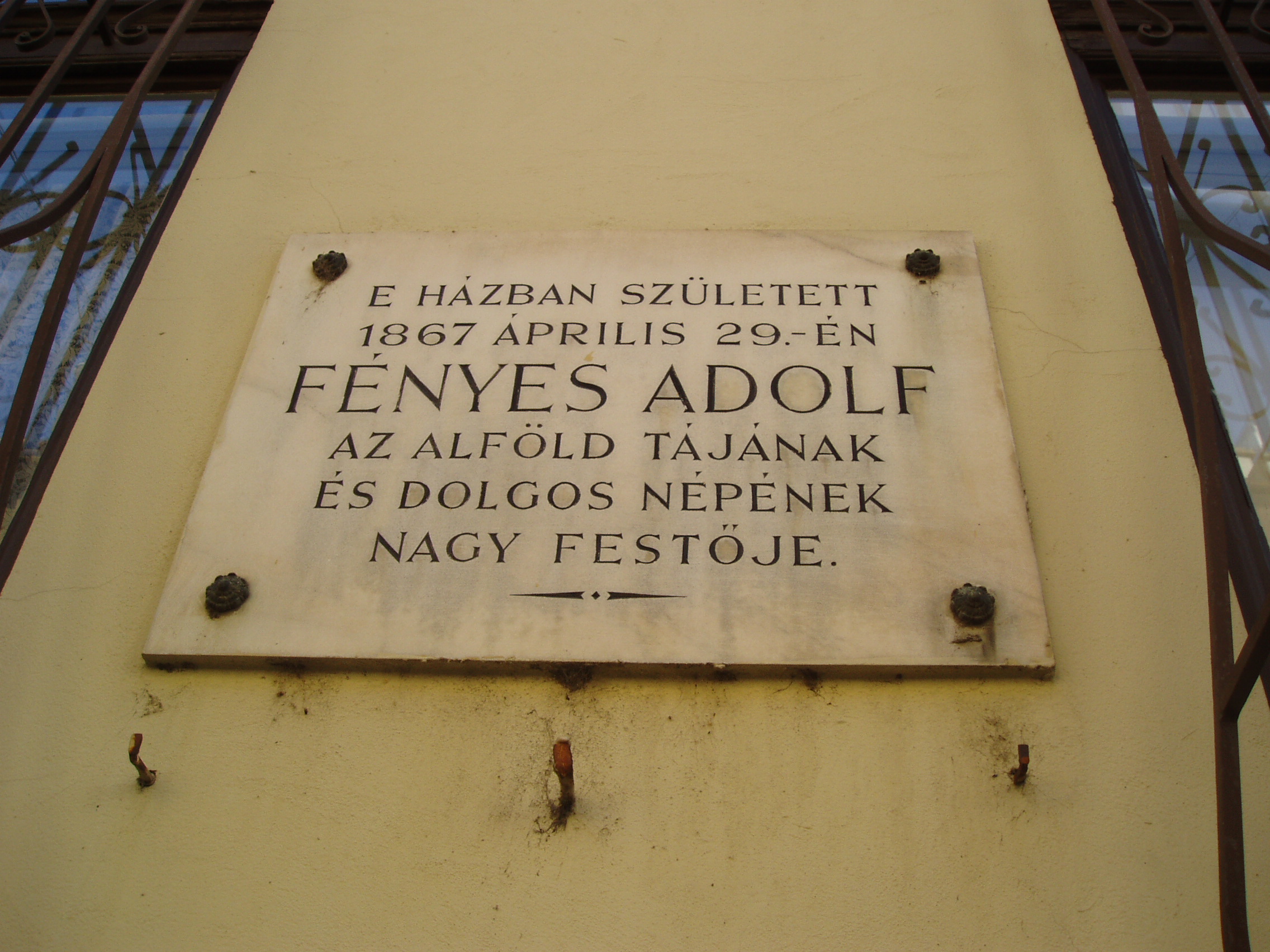 Nyilvános 1152 | 1846 | Kecskemét, Wesselényi utca 6. | Az emeletes városi házon olvasható emléktábla szerint itt született 1867. április 29-én Fényes Adolf. Heltai Nándor, kecskemét történetének kutatója szerint a tábla szövege pontatlan, mert a festőművész nem ebben a házban, hanem a helyén állott korábbi épületben született. Szerinte ez a ház Moór Emánuel zongoraművész és feltaláló szülőháza. Ő viszont Fényes Adolfnál néhány évvel korábban, 1863-ban született, tehát - ha Heltai információja helyes - ő sem ebben a házban, hanem az elődében látta meg a napvilágot. A fénykép 2006 augusztusában készült. Felh. irod.: Heltai Nándor: Kecskemét. Kecskeméti Lapo, 1998 |
