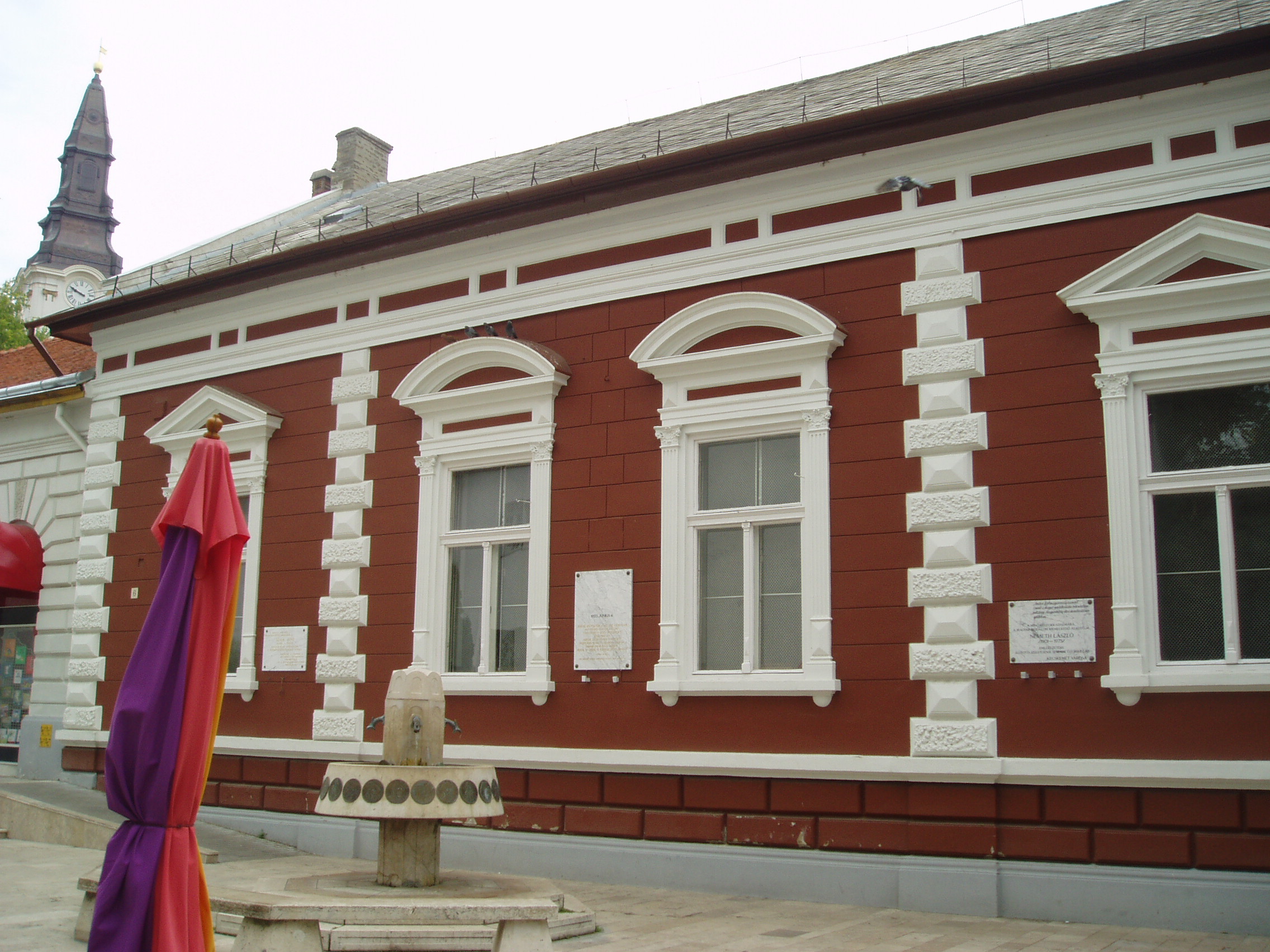 Nyilvános 1049 | 1579 | Kecskemét, Kéttemplomköz 6. | A református Ókollégium (lásd: Kecskemét, Kálvin tér 1.) Kéttemplomközre néző tornatermének falán helyezték el Németh László író, a "Kert-Magyarország eszme apostolának" emléktábláját. Ugyanitt egy másik márványtábla Ádám Jenőre, Kodály Zoltán egyik legközelebbi munkatársára emlékeztet. A fénykép 2006 augusztusában készült. |
