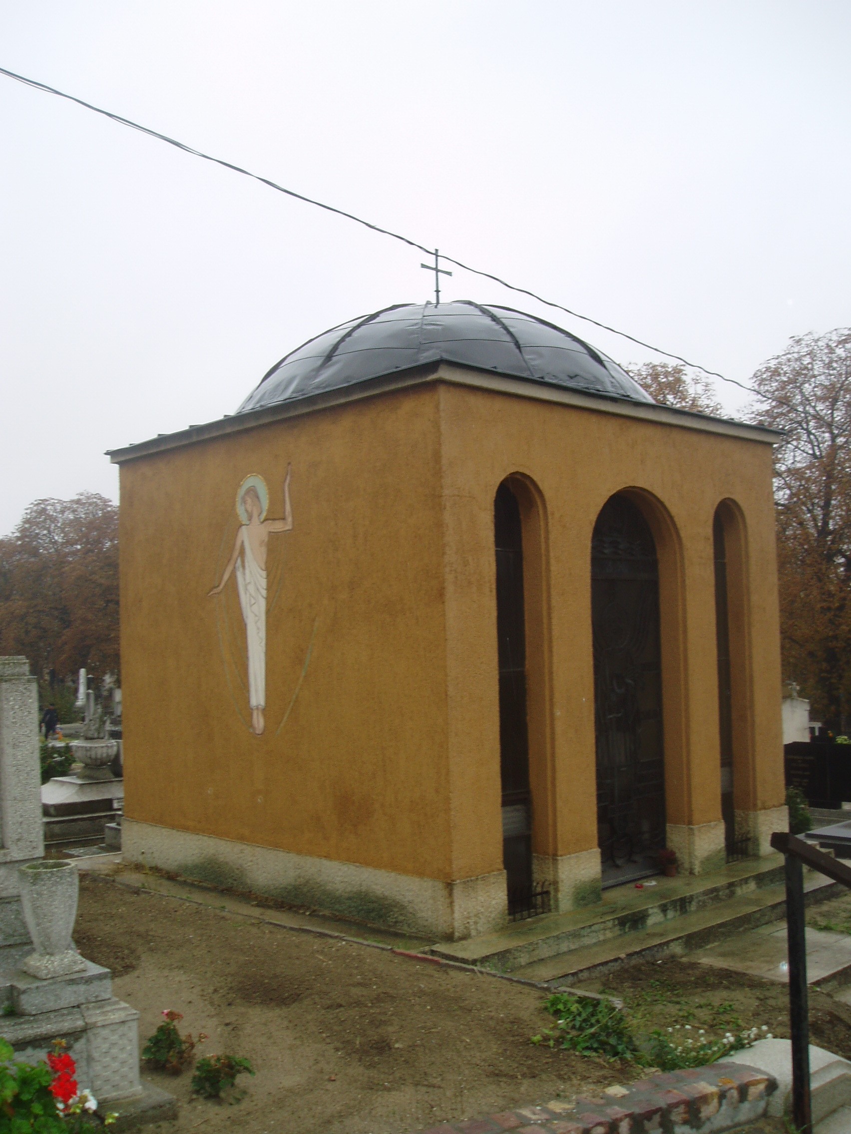 Nyilvános 1000 | 1857 | Baja, Rókus utca: Rókus temető: az Éber család kriptája | A temetőkápolna közelében áll az Éber család kriptája. Más családtagok körében itt nyugszik Éber Sándor (1878-1947) festőművész, fia, ifj. Éber Sándor 1909-1985) és leánya, az 1905-ben született és közelmúltban elhunyt (pontos évszámot sehol nem találtam) Éber Anna festőművészek. A kriptát valószínűleg ifj. Éber Sándor tervezte, de sajnos erről sem találtam semmilyen forrást. A művészcsalád egykori otthona ma Éber Emlékházként látogatható (lásd: Baja, Jókai u. 19.). A fénykép 2007 októberében készült. |