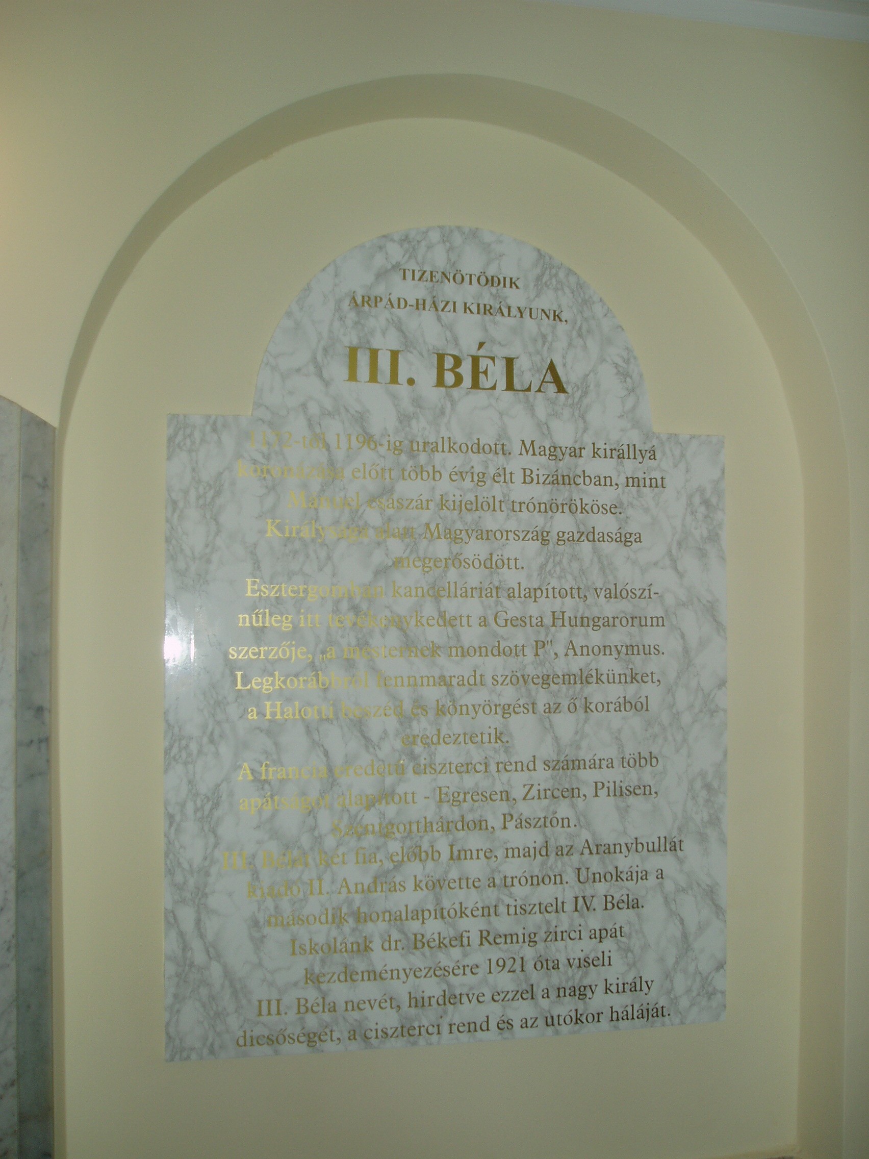 Nyilvános 1025 | 1492 | Baja, Szent Imre tér 5. III. Béla Gimnázium: III. Béla emléktáblája az iskola előcsarnokában | Az 1757-ben alapított iskola mai épületét 1815-ben emelték, majd 1892-ben és 1931-ben jelentősen bővítették, alakították. Korábban a közelben ma is álló ferences kolostorban (lásd: Baja, Bartók B. u. 1-3.) folyt a tanítás. Az intézmény a ferencesek után 1879-től a ciszterci rendé lett. III. Béla nevét, aki a ciszter rendet letelepítette Magyarországon, az 1921/22-es tanévben vette fel. Ma már szobra is ott áll az épület előtt. 1948 óta állami iskola. Híres növendéke volt Nagy Ignác író (1819–1821), Türr István (1835–1840), Tóth Kálmán költő (1839–1845), Szarvas Gábor nyelvész (1842–1848). Pályakezdőként az 1905/06-os tanévben itt tanított Babits Mihály. Az iskolának a zenei életben nevet szerzett diákjai is voltak. Ide járt gimnáziumba az 1902/03-as tanévtől nyolc éven át a bajai születésű Kun Imre (1892–1977), a legendás hangversenyrendező és az 1940-es évek elején a szintén Baján született Lukin László (1926–2004) zenepedagógus, karnagy. A fénykép 2007 októberében készült. Felh. irod.: Bálint László: A bajai III. Béla Gimnázium. Bp. Tankönyvkiadó, 1989 |