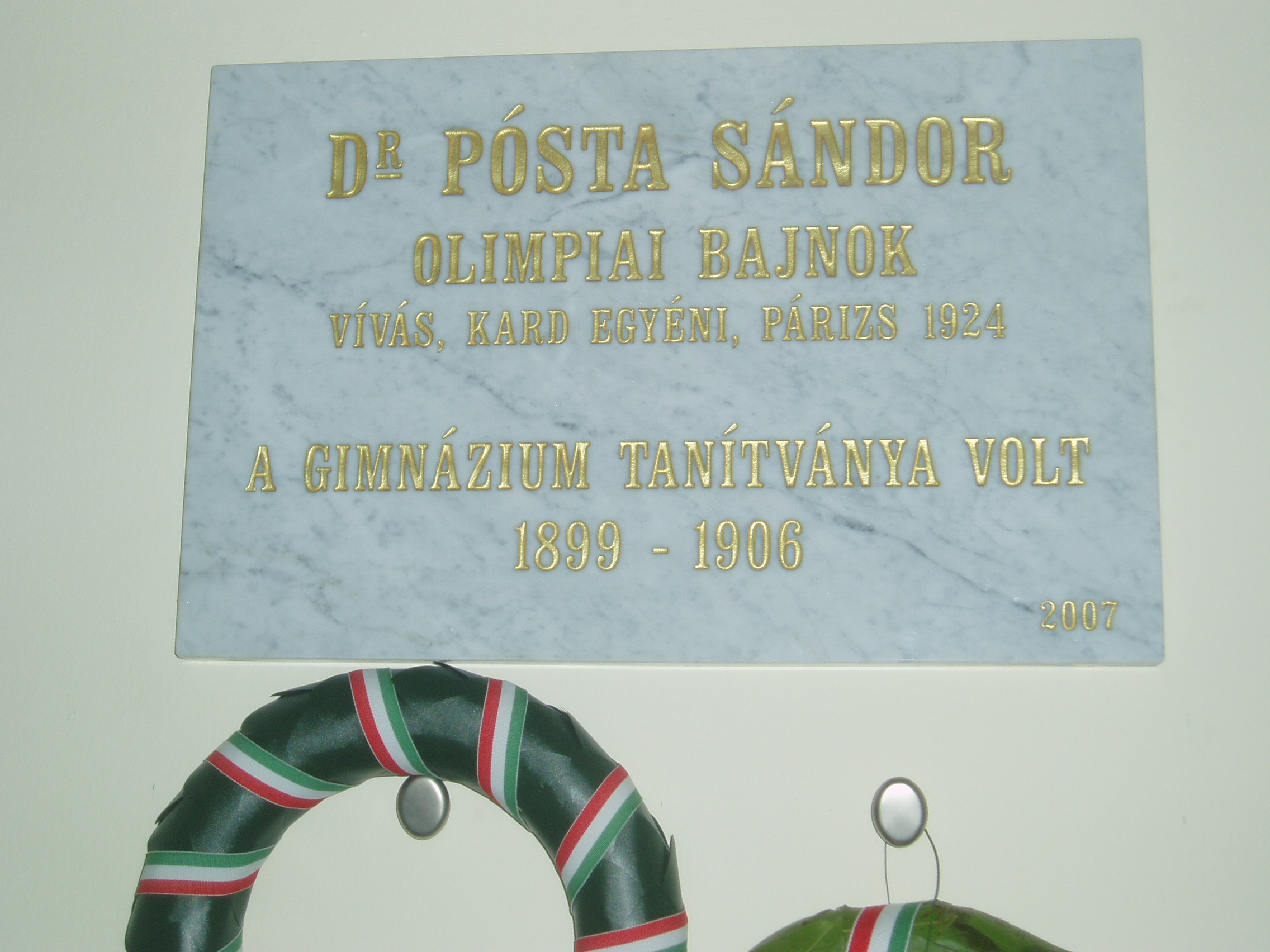 Nyilvános 982 | 1470 | Baja, Szent Imre tér 5. III. Béla Gimnázium: Pósta Sándor olimpiai bajnok emléktáblája az előcsarnokban | Az 1757-ben alapított iskola mai épületét 1815-ben emelték, majd 1892-ben és 1931-ben jelentősen bővítették, alakították. Korábban a közelben ma is álló ferences kolostorban (lásd: Baja, Bartók B. u. 1-3.) folyt a tanítás. Az intézmény a ferencesek után 1879-től a ciszterci rendé lett. III. Béla nevét, aki a ciszter rendet letelepítette Magyarországon, az 1921/22-es tanévben vette fel. Ma már szobra is ott áll az épület előtt. 1948 óta állami iskola. Híres növendéke volt Nagy Ignác író (1819–1821), Türr István (1835–1840), Tóth Kálmán költő (1839–1845), Szarvas Gábor nyelvész (1842–1848). 1899-1906 között itt tanult Pósta Sándor, aki az 1924-es párizsi olimpián kard egyéniben olimpiai bajnok lett. Pályakezdőként az 1905/06-os tanévben itt tanított Babits Mihály. Az iskolának a zenei életben nevet szerzett diákjai is voltak. Ide járt gimnáziumba az 1902/03-as tanévtől nyolc éven át a bajai születésű Kun Imre (1892–1977), a legendás hangversenyrendező és az 1940-es évek elején a szintén Baján született Lukin László (1926–2004) zenepedagógus, karnagy. A fénykép 2007 októberében készült. Felh. irod.: Bálint László: A bajai III. Béla Gimnázium. Bp. Tankönyvkiadó, 1989 |