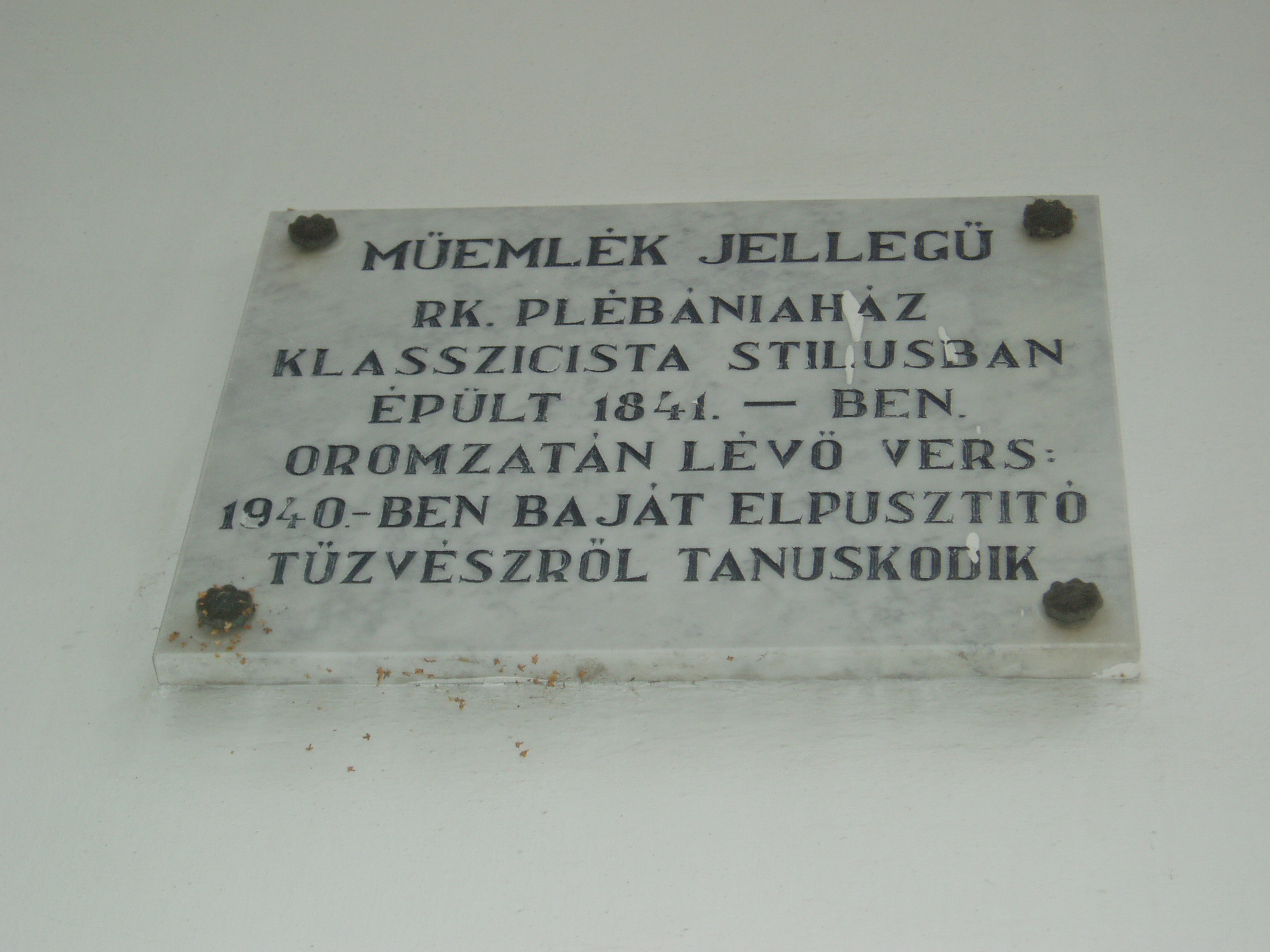 Nyilvános 1011 | 1432 | Baja, Szent Imre tér 6. R. k. plébániaház | A műemlék jellegű római katolikus plébániaház klasszicista stílusban épült újjá 1841-ben. Az oromzatán olvasható kronosztikonon a várost porig égető 1840. május 1-jei tűzvész napját örökítették meg. A tűzvész során elpusztult 1282 lakóház, 812 melléképület, 5 templom, a zsinagóga és a kórház, s 46 ember halt meg a tűzben. 1957 és 1962 között itt élt dr. Belon Gellért (1911-1987) plébános, későbbi pécsi püspök. A fénykép 2007 októberében készült. Felh. irod.: www.vendegvaro.hu |