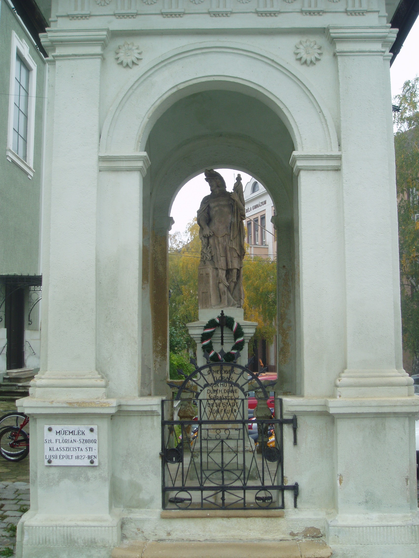 Nyilvános 1114 | 2096 | Baja, Szent Imre tér 5. Szent Flórián-szobor | A plébániatemplom melletti szoborfülkében áll 1827 óta Domenico Berti kőfaragó Szent Flóriánt ábrázoló, klasszicista stílusú szobra. A tűzoltók védőszentjének szobrát egy tekintélyes bajai polgár, Arnó György állíttatta azzal a fohásszal, hogy Szent Flórián védelmezze meg a várost a tűztől. Az első jelentős tűzvész, amiről források szólnak, 1742-ben pusztított Baján. Az ezt követő másfél évszázadban több mint ezerszer lobbant fel tűz a városban. Nagy tűz volt 1806-ban és 1819-ben, 1840-ben pedig az egész város leégett. A fénykép 2007 októberében készült. Felh. irod.: www.vendegvaro.hu Gál Zoltán: A bajai tűzoltóság hőskora. = www.bacskaisport.hu |