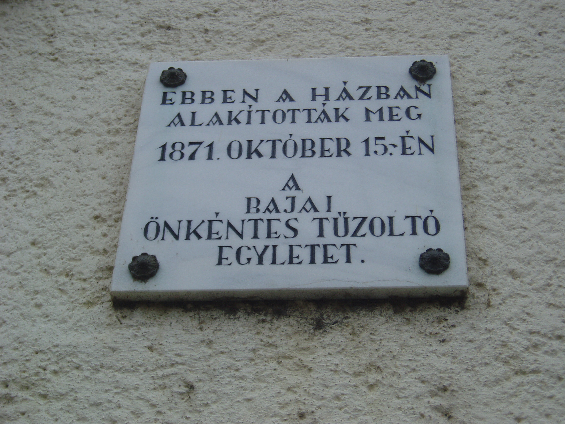 Nyilvános 1078 | 1553 | Baja, Táncsics utca 12. | Mint az épületen elhelyezett emléktáblán is olvasható, ebben a házban alakult meg 1871. október 25-én a bajai Önkéntes Tűzoltó Egylet. Történelme során több nagy tűzvész is pusztított Baján. Az első jelentős, forásokkal is alátámasztott tűz 1742-ben emésztette fel a város nagy részét. Az ezt követő másfél évszázadban több, mint ezerszer lobbant fel a tűz a településen. Nagy tűz volt 1806-ban és 1819-ben, 1840-ben pedig az egész város leégett. A fénykép 2007 októberében készült. Felh. irod.: Gál Zoltán: A bajai tűzoltóság hőskora. = www.bacskaisport.hu |