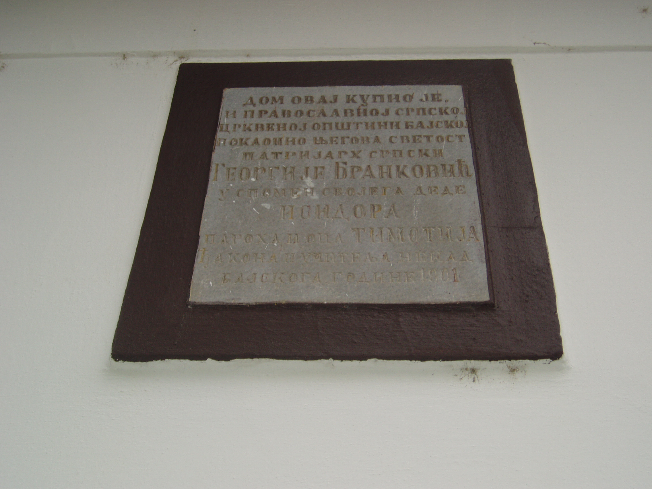 Nyilvános 1066 | 1479 | Baja, Táncsics utca 19. | A görögkeleti szerb paplak homlokzatán olvasható emléktábla szövege magyarul a következő: "Ezt a házat Georgije Brankovity szerb pariarcha vette meg és a bajai Görögkeleti Szerb Egyházközségnek adományozta nagyapja, Izidor Paro és apja, Thimotci diakónus és valamikori bajai tanár emlékére 1901-ben." A fénykép 2007 októberében készült. Felh. irod.: Történelmi és kegyeleti emlékhelyek. = www.kjmk.hu/emlek |