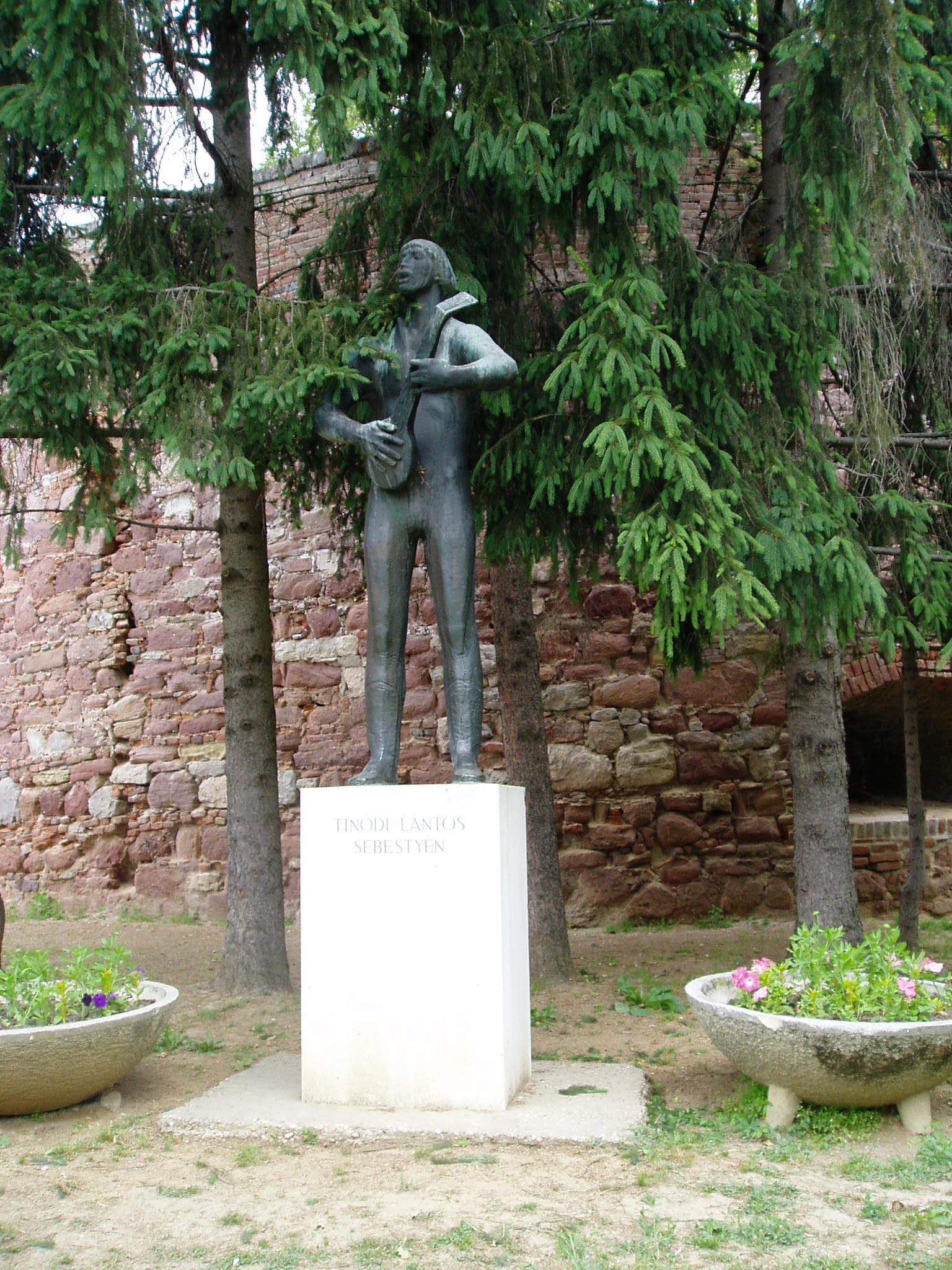Nyilvános 1136 | 1786 | Szigetvár, Vár: Tinódi Lantos Sebestyén szobra | Kiss István Tinódi Lantos Sebestyént ábrázoló szobra a vár déli kapujánál áll. Tinódi Lantos Sebestyén (1515 k. - 1556), a magyar reneszánsz neves lantos-énekmondója a közelben, a mai Rózsafa és Nagypeterd községek közötti, azóta elpusztult faluban, Tinódon született. Szigetváron Török Bálint alatt szolgált. A fénykép 2005 júniusában készült. |