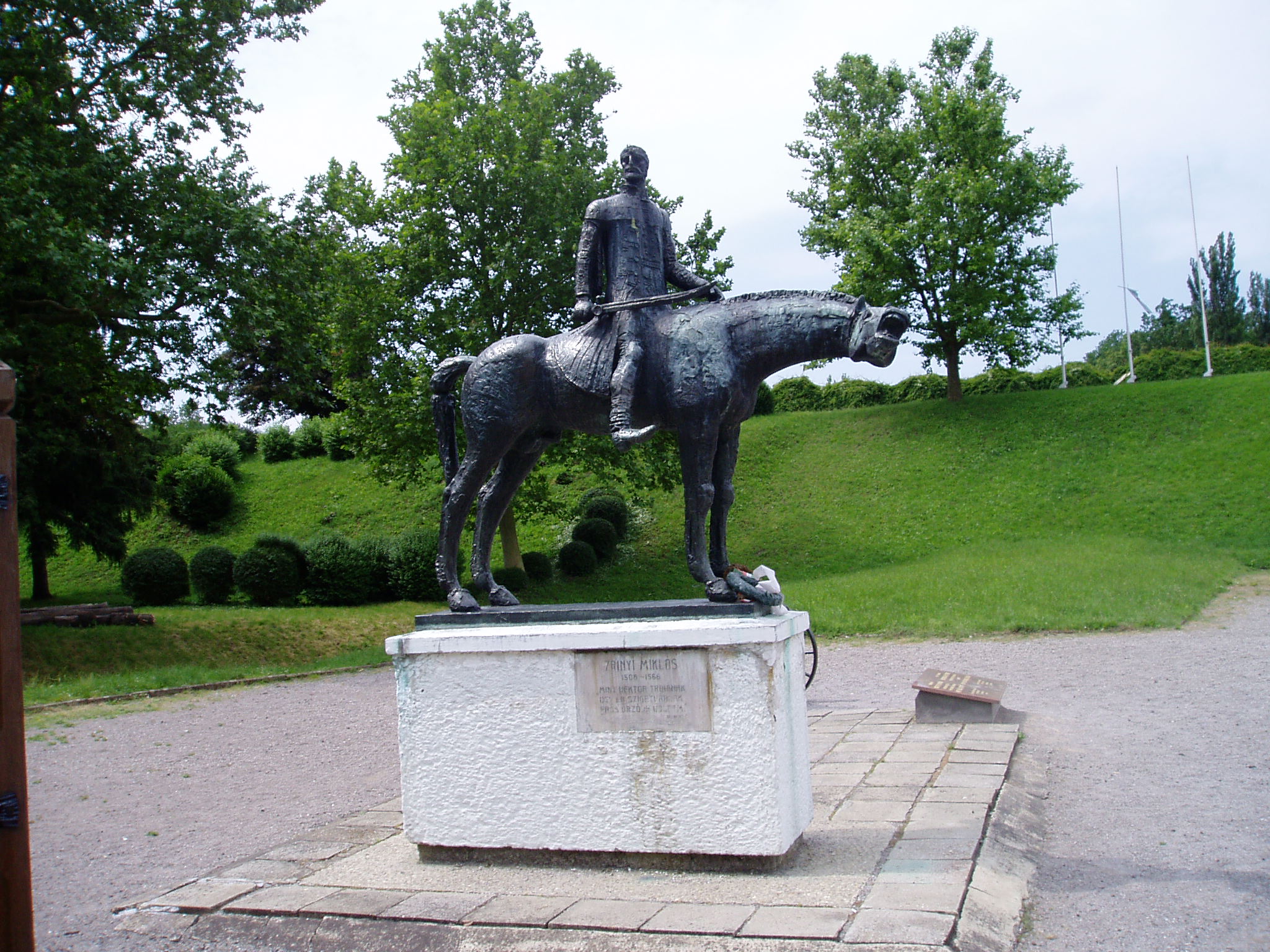 Nyilvános 1120 | 1814 | Szigetvár, Vár: Zrínyi Miklós emlékműve | A négyszög alaprajzú külső tornyos vár építése a XV. században kezdődött, majd az új tulajdonosok folyamatosan megerősítették. Az épület lényegében még ma is a XVI. századi elrendezését tükrözi. A vár központi épülete a Szulejmán dzsámi és az Andrássy-lak. A dzsámit a győztes szultán tiszteletére emelték, majd ehhez épült hozzá a XIX. században a nyári lakként használt kastély. A várat ma közel 8 m magas téglafal övezi, sarkain szabálytalan alaprajzú üres bástyákkal, a déli oldalon új barokk kapuval - ahonnan a hosszú boltozatos kapualjon keresztül vezet az út a várba. A déli oldal kötőgátján kis barokk torony látható, nyitott árkádokkal, sátortetővel. Ma a Zrínyi Miklós Múzeum vártörténeti kiállítása látható itt. A vár legnevezetesebb ostroma, amiről a múzeumi kiállítás is megemlékezik, Zrínyi Miklós nevéhez fűződik, aki 33 napon át védte a várat Szulejmán szultán túlerejével szemben, majd mikor a vár lángba borult, az ellenségre támadt. 1566. szeptember 7-i "kirohanását", hősi halálát és a csata történetét dédunokája, a költő, hadvezér Zrínyi Miklós a Szigeti veszedelem című eposzában (1651) örökítette meg. Zrínyi Miklós szobra azon a helyen áll, ahol a szigetvári hős és maradék csapata kirontott az ellenségre. A fénykép 2005 júniusában készült. Felh. irod.: Látnivalók Pécsett és Baranyában. /Vendégváró/ Miskolc, Well-PRess, 1998 |