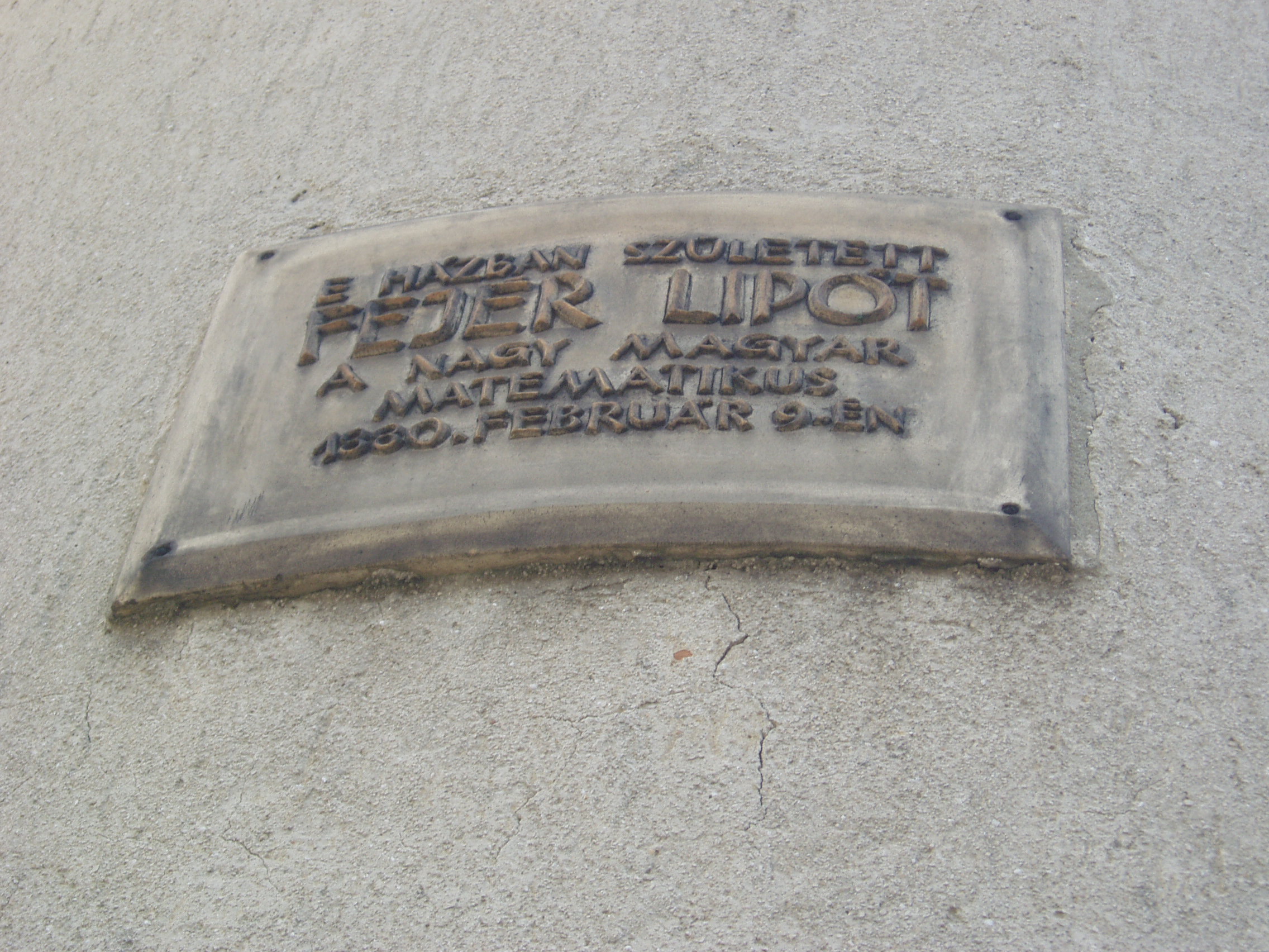 Nyilvános 1566 | 3327 | Pécs, Anna utca 16. | Mint a homlokzatán elhelyezett emléktábla is tanúsítja, ebben a házban született 1880. február 9-én Fejér Lipót 1880-19599, a nagy magyar matematikus. Édesanyja Goldberger Viktória, édesapja Weisz Samu kiskereskedő. Anyai dédapja Nachod Sámuel orvos, nagyapja Goldberger József, az első magyar–héber társalgási nyelvkönyv szerzője. Elemi iskoláit Pécsett végezte, ugyanitt érettségizett 1897-ben a főreáliskolában. A főreáliskola első éveit nehezen végezte, matematikából magántanárt kellett mellé fogadni... Budapesti és berlini tanulmányai után 1905 - 1911 között a kolozsvári egyetemen, majd 1911-től haláláig a Budapesti Tudományegyetemen tanított. Körülötte alakult ki a világhírű Fejér-iskola (Csillag Pál, Egerváry Jenő, Erdős Pál, Fekete Mihály, Kalmár László, Lukács Ferenc, Pólya György, Riesz Marcel, Szász Ottó, Szegő Gábor, Szidon Simon, Turán Pál). A Fourier-sorok analízisén kívül jelentős eredményeket ért el a konstruktív függvénytanban (Fejér-interpoláció és mechanikus kvadratúra) és a komplex függvénytanban. A róla elnevezett Fejér-tétel a Fourier-sorok összegezhetőségére vonatkozik. „Kívülállónak nem lehet elmondani, hogy milyen volt Fejér Lipót. Óriás volt. Földöntúli vigasztalás a puszta lénye. Aki nem ismerte, az valamit nem tud a világról, és sohasem fogja megtudni.” (Ottlik Géza) A fénykép 2006 júliusában készült. Felh. irod.: www.info.omikk.bme.hu/archivum/magyarok/htm/fejerrov.htm Magyar életrajzi lexikon |