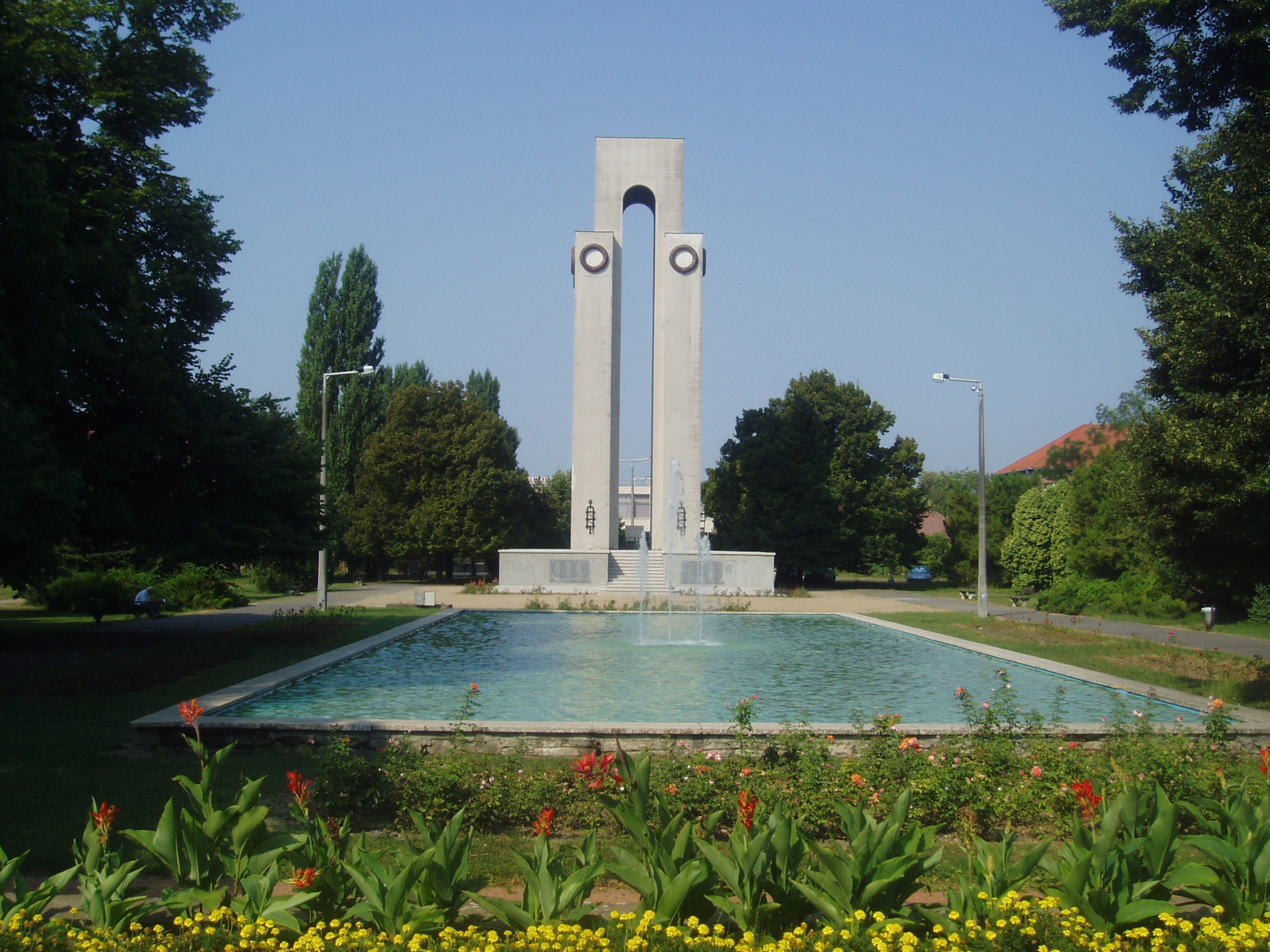 Nyilvános 1628 | 4779 | Mohács, Hősök parkja: Hősök emlékműve | Az egykori vásártérből Árkay Bertalan tervei alapján átalakított Hősök parkjában áll az I. és II. világháború áldozatai előtt tisztelgő hősi emlékmű. Az I. világháborút követően Visy Zoltán pécsi műépítész tervei szerint 1935-ben építették fel a négy oszlopon nyugvó, 24 méter magas emlékművet. Így rótta le kegyeletét a város a harcokban elhunyt 439 mohácsi hős emléke előtt. Erre az emlékműre került a II. világháború áldozatainak és az 1956-os forradalom hőseinek neve is. A fénykép 2006 júliusában készült. Felh. irod.: Látnivalók Pécsett és Baranyában. Miskolc, Well-PRess, 1998 www.mohacs.hu www.vendegvaro.hu |