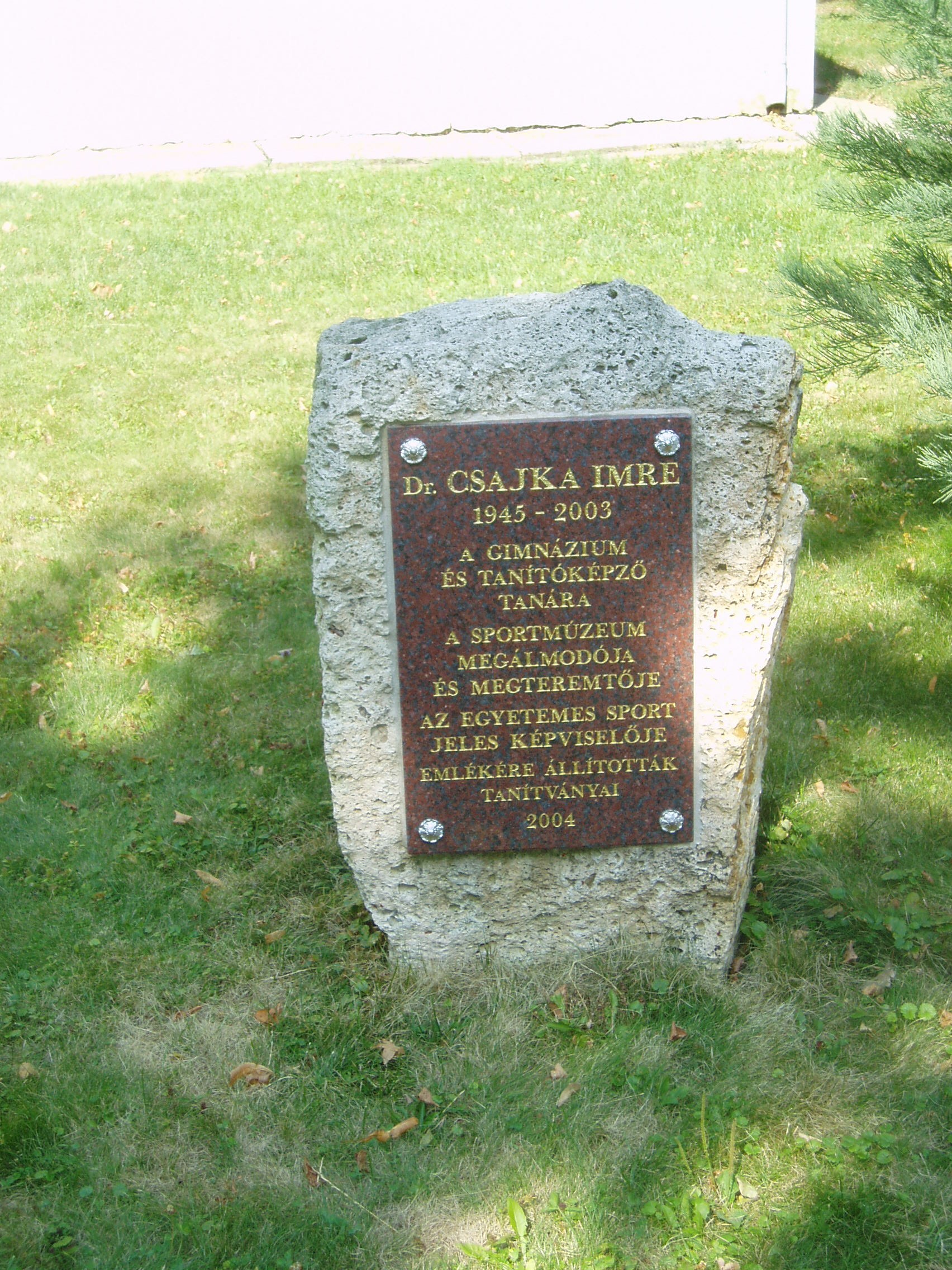 Nyilvános 1049 | 1986 | Sárospatak, Iskolakert: Csajka Imre emlékköve | A Református Kollégium (lásd: Sárospatak, Rákóczi u. 1.) bejáratával szemben találjuk az Iskolakertnek nevezett parkot. Az 1980-as években természetvédelmi területté nyilvánított Iskolakert sajátos nemzeti érték, mely egyedülálló az országban. Sétányai mentén Patakhoz kötődő jeles személyiségek szobrai állnak. Az iskolakertben álló műemlék tornacsarnok közelében is elhelyeztek néhány feliratos emlékkövet. A képen a dr. Csajka Imre tanár emlékezetére állított kő látható. Csajka Imre kutatta a pataki kollégium sportéletét, több könyvet is megjelentetett a témában. A fénykép 2007 augusztusában készült. Felh. irod.: Látnivalók Borsod-Abaúj-Zemplén megyében. Miskolc, Well-PRess, 1995 |