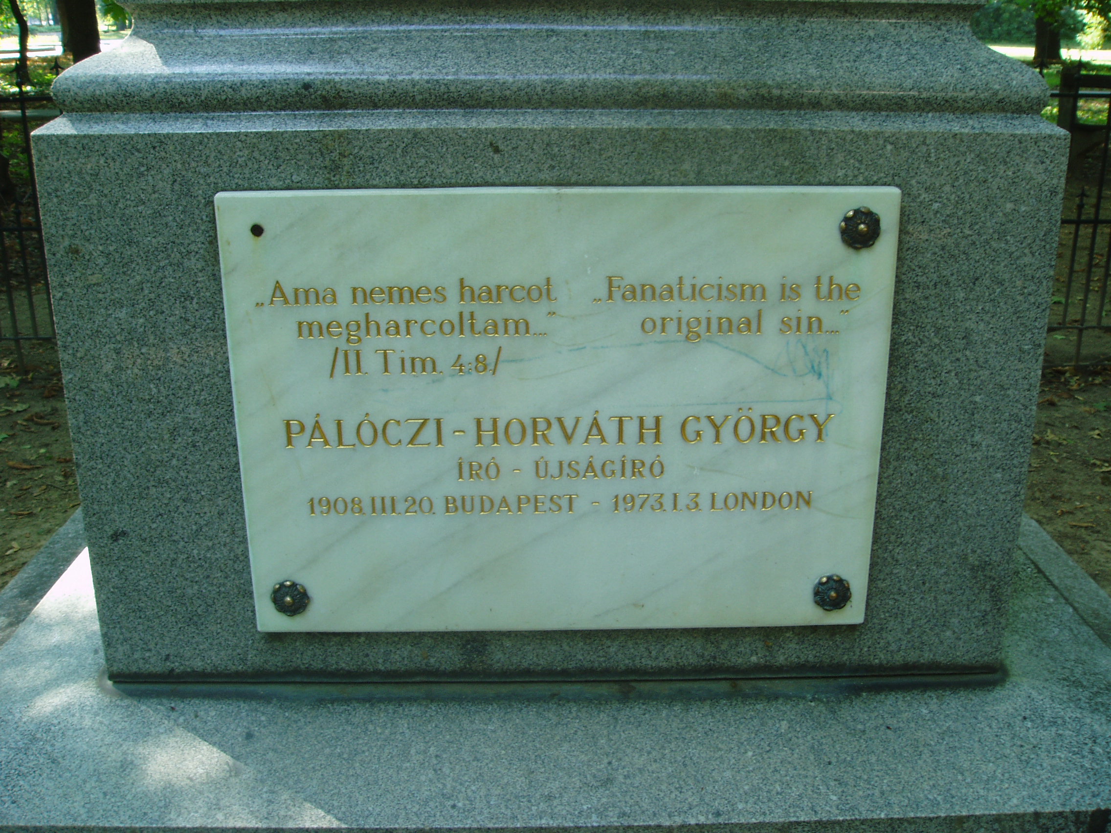 Nyilvános 1020 | 1517 | Sárospatak, Iskolakert: Pálóczi-Horváth-emlékmű | A Református Kollégium (lásd: Sárospatak, Rákóczi u. 1.) bejáratával szemben találjuk az Iskolakertnek nevezett parkot. Az 1980-as években természetvédelmi területté nyilvánított Iskolakert sajátos nemzeti érték, mely egyedülálló az országban. Sétányai mentén Patakhoz kötődő jeles személyiségek szobrai állnak. 1870 körül avatták fel az Iskolakertben a Pálóczi-Horváth-testvérek emlékművét. Készítője báró Vay Miklós főiskolai gondnok, szobrászművész. A rendszerváltás után itt helyezték el Pálóczi-Horváth György (1908-1973) emléktábláját (a család leszármazottja lehetett, de erre nem találtam bizonyítékot - K.K.). Az író, újságíró fordulatos életpályát futott be. Évekig élt az Egyesült Államokban, majd hazatért rövid időre, s a Pesti Napló szerkesztőségében dolgozott. Az 1930-as évek végén ismét elutazott, és Angliában telepedett le, s az angol külügyi szolgálat kötelékébe került. Isztambulban angol összekötőként ő tárgyalt a Kállay-kormány által kiküldöttekkel, akik a kormányfő megbízásából Magyarország háborúból való kiugrását készítették elő. A háború után hazatért Budapestre, s belépett a kommunista pártba. Felelős szerkesztője lett a Tovább című pártlapnak, vezette a Magyar Rádió idegen nyelvű osztályát, majd a Hungária Könyvkiadó irodalmi vezetője lett. Megválasztották a magyar ENSZ-társaság főtitkárává. 1949-ben koholt vádak alapján letartóztatták, öt évet töltött börtönben. 1954-ben rehabilitálták, 1956 végén elhagyta Magyarországot és Londonban telepedett le. Magyar nyelvű írásai főleg a londoni Irodalmi Újságban jelentek meg, amelynek főmunkatársa volt. Visszaemlékezéseit "Elveszett nemzedék" címmel írta meg. Kitűnő műfordító is volt. Londonban hunyt el 1973-ban. A fénykép 2007 augusztusában készült. Felh. irod.: Látnivalók Borsod-Abaúj-Zemplén megyében. Miskolc, Well-PRess, 1995 www.sarospatak.hu/nevezetessegek Magyar életrajzi lexikon Rainer M. János: Esetek a magyar hírszerzés történetéből, 1957-1967. = Rubikon 2002. június-július |