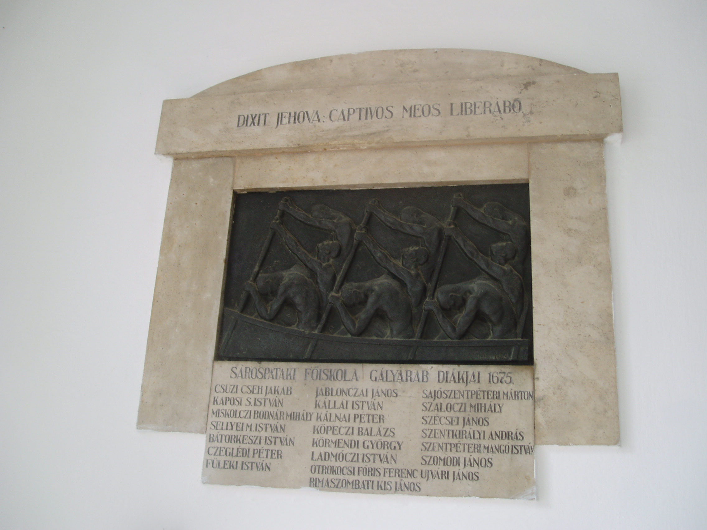 Nyilvános 1045 | 1595 | Sárospatak, Rákóczi utca 1. Református Kollégium | A kollégium főépülete, a Nagy Kollégium a Rákóczi út északi végén található, mely 1804–1814 között korai klasszicista stílusban épült. Szép ráccsal ellátott, háromíves nyílású kapuzat vezet be az un. „nagyportá”-ba, amelyet két sor vaskos pillér három hajóra oszt. Kétoldalt a falakon az iskolatörténet néhány fontosabb eseményének, illetve a kollégium nagy alakjainak bronz domborművű ábrázolásait helyezték el. A képen a pataki kollégium gályarab diákjainak emléktáblája látható (Dabóczy Mihály alkotása, 1930-as évek vége). 1673-ban, a Wesselényi-összeesküvés (lásd: Sárospatak, Szent Erzsébet u. 19. Sub Rosa) leleplezése után I. Lipót császár református papokat és tanítókat ítélt gályarabságra. Közülük huszonketten pataki diákok voltak. Az ellenreformáció áldozatait 1676. február 11-én Ruyter holland admirális váltotta ki a rabságból és küldte haza (lásd még: Hajdú-Bihar megye/Debrecen, Emlékkert). A fénykép 2007 augusztusában készült. Felh. irod.: Détsy Mihály: Sárospatak. Bp. Corvina, 1974 Látnivalók Borsod-Abaúj-Zemplén megyében. Miskolc, Well-PRess, 1995 www.sarospatak.hu/nevezetessegek |