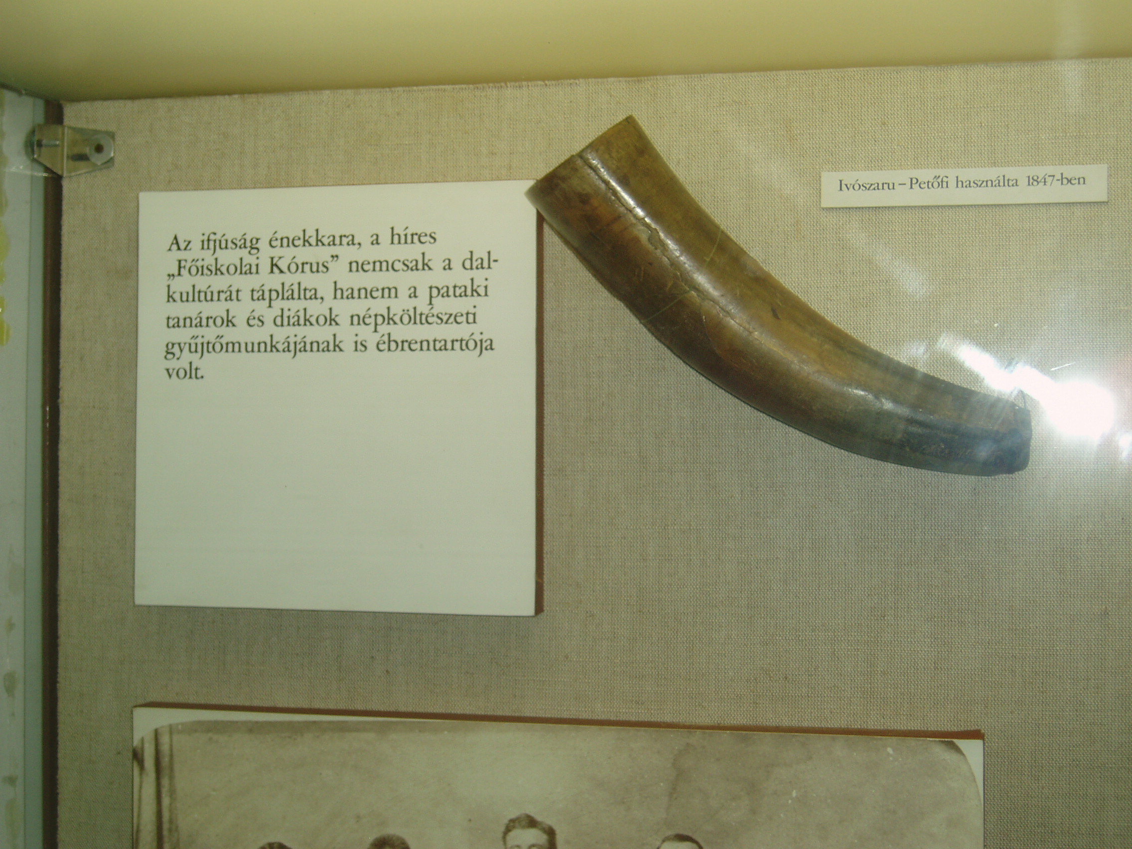 Nyilvános 1030 | 1448 | Sárospatak, Rákóczi utca 1. Református Kollégium | A Kollégium főépületének szárnyai által határolt tágas udvarban áll a régi iskolaépületek utolsó maradványa, az ún. Berna-sor. 1771/72-ben a fizika oktatása számára és a fizikaprofesszor lakásául épült. Az egyemeletes, hosszú szárny déli oldalát később kétszintes, árkádos tornáccal bővítették, feljáróval a nyugati oldalon. Az épület a korabeli provinciális magyar építészet szép példája. Az emelet boltozott termeiben a kollégium történetét bemutató kiállítást rendeztek be. A képen a Petőfi Sándor pataki látogatása alkalmából a költő által használt ivószaru látható. Petőfi 1847. július 9-én, útban menyasszonyához szállt meg Patakon. Vendéglátója Pálkövy Antal tanár volt (lásd: Sárospatak, Rákóczi utca 17.). A Kollégium énekkara vidám estét rendezett számára. A fénykép 2007 augusztusában készült. Felh. irod.: Détsy Mihály: Sárospatak. Bp. Corvina, 1974 |