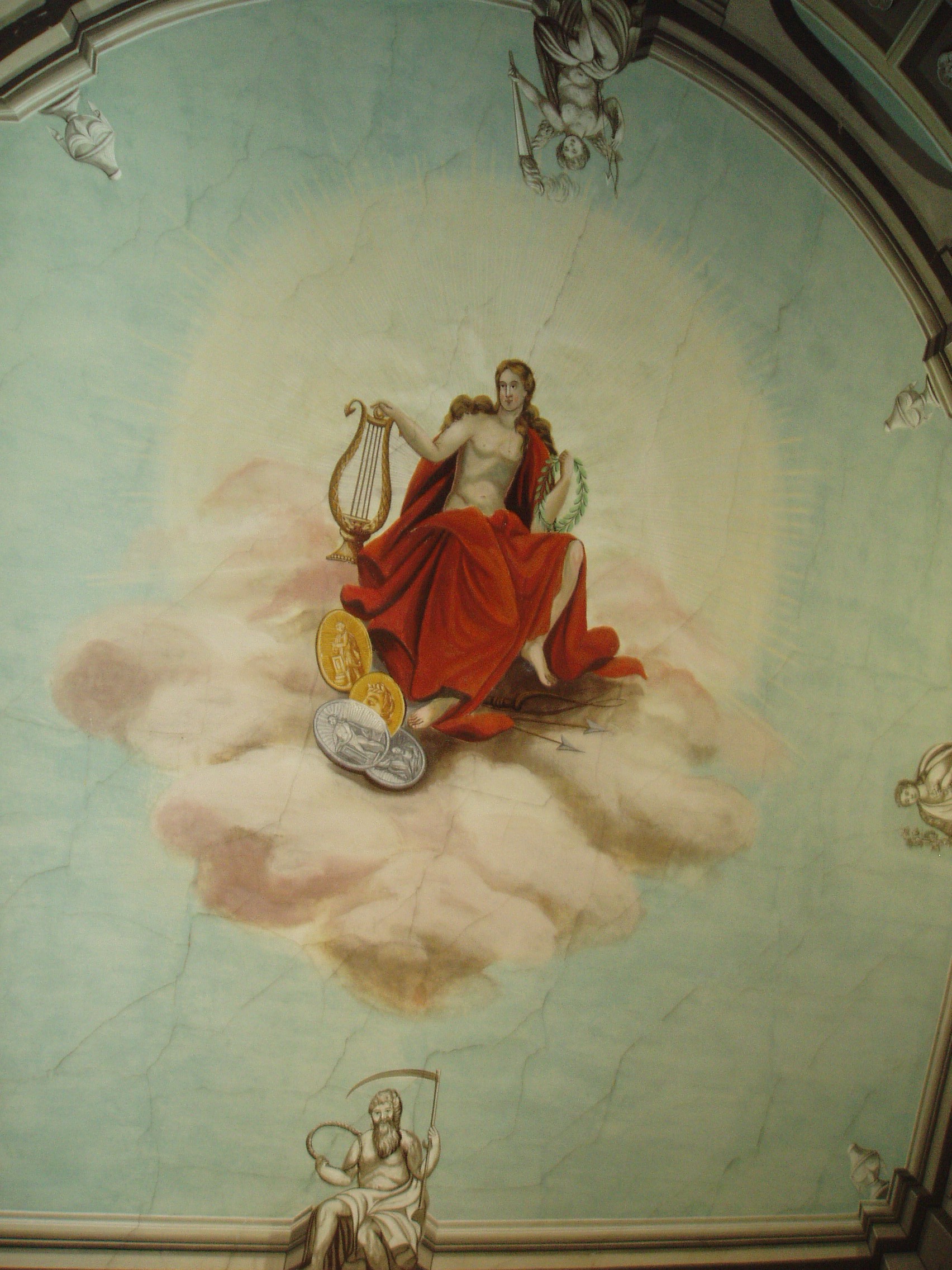 Nyilvános 1008 | 1508 | Sárospatak, Rákóczi utca 1. A Református Kollégium Könyvtára | A Kollégium főépületének emeletén található az intézmény nevezetes könyvtára. A terem belső kiképzése 1834-re készült el egy "Pollack" aláírású terv alapján, ezért a magyar klasszicizmus nagy mesterének, Pollack Mihálynak tulajdonítják a pompás interieurt. Az elnyújtott, két emeletet egybefoglaló termet fából épült dór oszlopsor veszi körül, amelynek gerendázata galériát tart. A falak mellett az oszlopsoron és a galérián belül XIX. századi könyvállványok hordozzák a nagy értékű könyvgyűjteményt. A terem padlózata csillagmintás berakású táblás parketta. A múzsát ábrázoló mennyezetfreskó Lintzbauer József kassai festő alkotása. A fénykép 2007 augusztusában készült. Felh. irod.: Détsy Mihály: Sárospatak. Bp. Corvina, 1974 www.gradatio.hu/nagykonyvtar |
