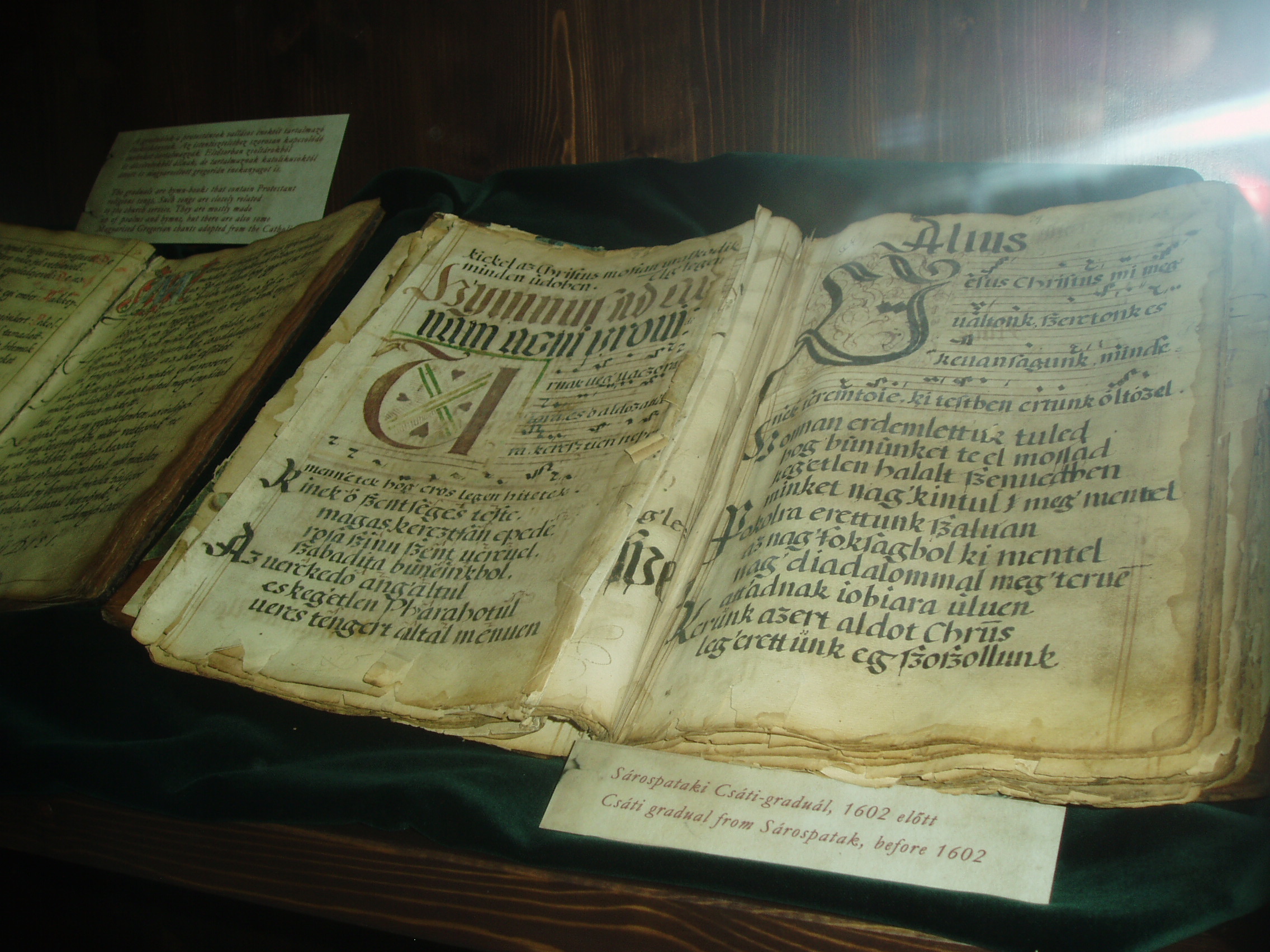 Nyilvános 1047 | 1479 | Sárospatak, Rákóczi utca 1. Református Kollégium könyvtára | Az 1531-ben alapított Sárospataki Református Kollégium könyvtára évszázadok óta az ország egyik legértékesebb könyvgyűjteménye. A második világháború előestéjén, 1938-ban állománya legbecsesebb részét Budapestre menekítették. Sajnos, nem lehetett előre látni, hogy a Sárospatakot elfoglaló szovjet csapatok megkímélték a kollégiumi könyvtárat, míg a Budapestre került kötetek a hadi események során eltűntek. Sorsukról sokáig semmit sem lehetett tudni, csak harminc év múlva derült ki, hogy a Nyizsnyij Novgorod-i Lenin Könyvtár egy részlegében őrzik őket. A rendszerváltás után tárgyalásokba lehetett bocsátkozni visszaadásukról, amelyre, sok vita után 2006. áprilisában kerülhetett sor. A hazatért 16–17. századi könyvek értéke nem pusztán azért felbecsülhetetlen, mert könyvritkaságokról van szó, hanem azért is, mert az elmúlt századokban ezeket a könyveket olvasták a kollégium diákjai, tanárai. A 96 latin, 33 magyar és 6 német nyelvű könyv több mint hatvan százaléka imádságoskönyv, a többi orvosi, jogi, történeti és útleíró mű. A visszaadott dokumentumok egyik nagy értéke a képen látható Csáti graduál. Az 1602 körül keletkezett kéziratos énekeskönyv 41 XVII. század előtti egyházi éneket tartalmaz. Bejegyzése szerint: „…Találtatott Tsáton… Szabó István urnál … a sárospataki reformata anya oskolának ajándékozta tiszt. Nagy Ferencz Ur 1799ik esztendőben.” A fénykép 2007 augusztusában készült. Felh. irod.: Détsy Mihály: Sárospatak. Bp. Corvina, 1974 www.gradatio.hu/nagykonyvtar Fehér Katalin: Hazatértek a sárospataki könyvek. = Könyv és nevelés 2006. 2. www.hik.hu/tankonyvtar/site/books/b91/ch03.html |