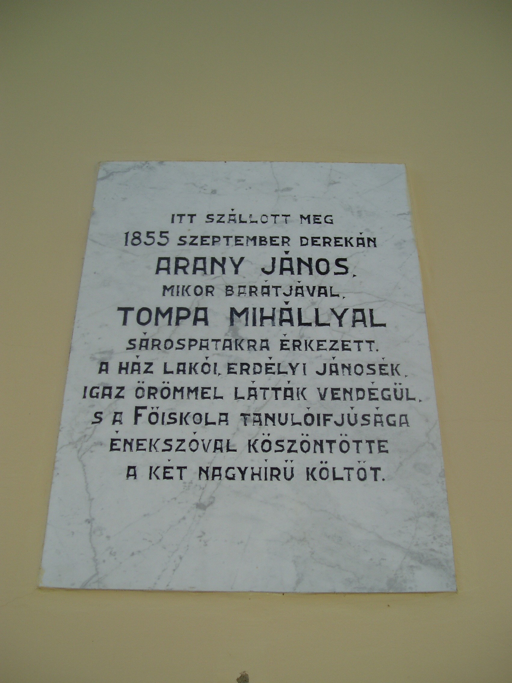 Nyilvános 1005 | 1513 | Sárospatak, Rákóczi utca 5. | A XVIII–XIX. századi épület a Kollégium bölcsészettanári lakása volt. 1851–1861 között itt lakott Erdélyi János költő, népdalgyűjtő, korábban pataki diák, ebben az időben a Református Kollégium bölcsészeti tanszékének professzora. Ebben a házban látta vendégül 1855. szeptember 20-án Arany Jánost és Tompa Mihályt. A fénykép 2007 augusztusában készült. Felh. irod.: Látnivalók Borsod-Abaúj-Zemplén megyében. Miskolc, Well-PRess, 1995 Erős Zoltán: Magyar irodalmi helynevek A-tól Z-ig. Bp. Kis-Lant Kiadó, 1995 |
