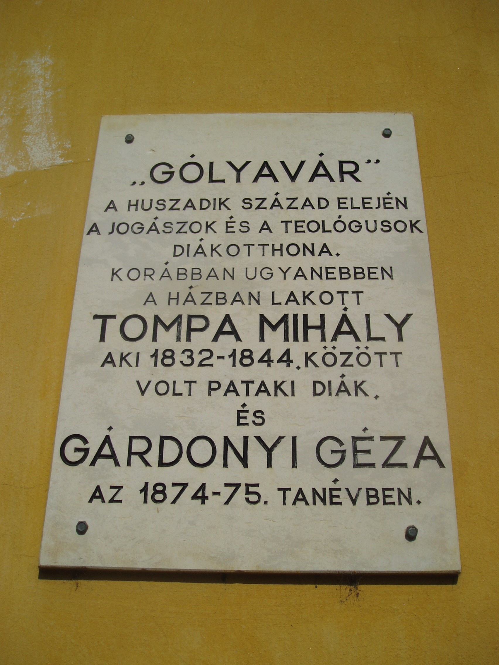 Nyilvános 972 | 1376 | Sárospatak, Rákóczi utca 6. | A barokk stílusú épület hajdan a közeli Református Kollégium (lásd: Sárospatak, Rákóczi u. 1.) ún. kisinternátusa volt. A XX. század elején a benne lakó első éves joghallgatókról és teológusokról a diákok Gólyavárnak nevezték. Korábban ugyanebben a házban lakott Tompa Mihály, aki 1832 és 1844 között, és Gárdonyi Géza, aki az 1874/75-ös tanévben volt pataki diák. A XIX. század második felétől itt működött Trócsányi Bertalan nyomdája és könyvkereskedése, amely jelentős szerepet játszott Sárospatak közművelődésében. A fénykép 2007 augusztusában készült. Felh. irod.: Látnivalók Borsod-Abaúj-Zemplén megyében. Miskolc, Well-PRess, 1995 Erős Zoltán: Magyar irodalmi helynevek A-tól Z-ig. Bp. Kis-Lant Kiadó, 1995 |
