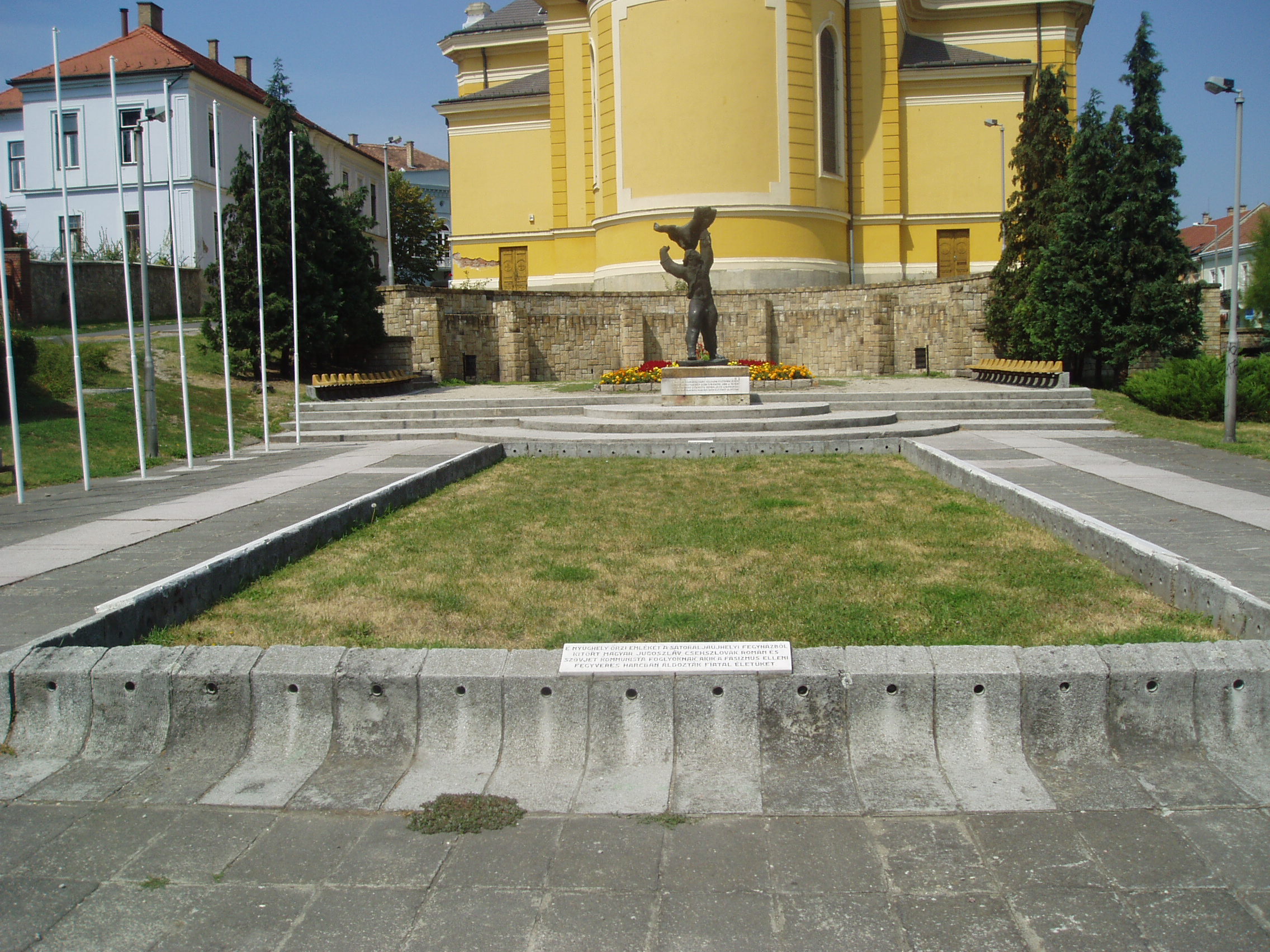 Nyilvános 945 | 1678 | Sátoraljaújhely, Hősök tere: a börtönkitörés emlékhelye | A Nagytemplom déli oldalánál alakították ki az 1944. március 22-i sátoraljaújhelyi börtönkitörés emlékhelyét. A pázsit alatt a tragikus események áldozatai - több nemzet fiai - nyugszanak. A monumentális, 1948-ban felállított szobor, melynek címe "Sassal viaskodó ifjú", Kerényi Jenő alkotása. Magyarország 1944. március 19-i német megszállása után az újhelyi börtönből kitörést szerveztek az itt őrzött politikai foglyok. A sikertelen lázadást kegyetlen megtorlás követte. A részletes eseményeket lásd: www.zhe.hu/Harcterkutatas/Satoraljaujhely/ujhelymain.html A kitörés áldozatainak holttestét a felkelés leverését követően ideiglenes sírokba, temetői árkokba helyezték. A háború befejezését követően, 1945. november 3-án ünnepélyes keretek között, ökumenikus szertartás keretében helyezték őket örök nyugalomra a közös sírban. 1948-ban felállították Kerényi Jenő szobrát, de hivatalos, állami felavatására a megváltozott politikai helyzetben nem került sor. Az 50-es években a felkelés és az antifasiszta mozgalom még életben levő tagjait perbe fogták, meghurcolták, s enyhülést csak a következő évtized hozott. Addigra a szobor már szimbólummá vált. Az emlékhelyet csak 1991. március 22-én avatta fel hivatalosan Göncz Árpád köztársasági elnök. A tragikus események és a hősök emlékét a börtön (lásd: Sátoraljaújhely, Kazinczy utca 35.) épületén is emléktáblák idézik. A fénykép 2007 augusztusában készült. Felh. irod.: www.zhe.hu/Harcterkutatas/Satoraljaujhely/ujhelymain.html Látnivalók Borsod-Abaúj-Zemplén megyében. Miskolc, Well-PRess, 2003 www.vendegvaro.hu |