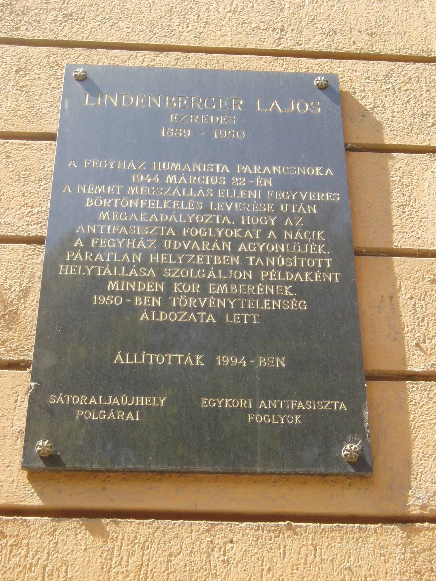 Nyilvános 1057 | 2104 | Sátoraljaújhely, Kazinczy utca 35. Sátoraljaújhelyi Fegyház és Börtön | Az utcai homlokzaton Lindenberger Lajos ezredes (1889-1950) emléktáblája olvasható. A fegyház humanista parancsnoka 1944. március 22-én a német megszállás elleni fegyveres börtönfelkelés leverése után megakadályozta, hogy az elfogott résztvevőket a nácik a fegyház udvarán agyonlőjék. Lindenbergert 1949-ben az Államvédelmi Hatóság „háborús bűntett” miatt a lakásából elhurcolva őrizetbe vette. A túlélésüket neki köszönhető korábbi politikai elítéltek mentő vallomásai és segítő erőfeszítései ellenére halálra ítélték. Vélhetően 1950 nyarán, – még az ítélet végrehajtása előtt – a fogva tartás körülményei és a kihallgatásokkal járó megpróbáltatások következtében elhunyt. A rendszerváltást követően halálos ítéletét felülvizsgálták és megsemmisítették. A fénykép 2007 augusztusában készült. Felh. irod.: Látnivalók Borsod-Abaúj-Zemplén megyében. Miskolc, Well-PRess, 2003 www.zhe.hu/Harcterkutatas/Satoraljaujhely/ujhelymain.html http://hu.wikipedia.org |