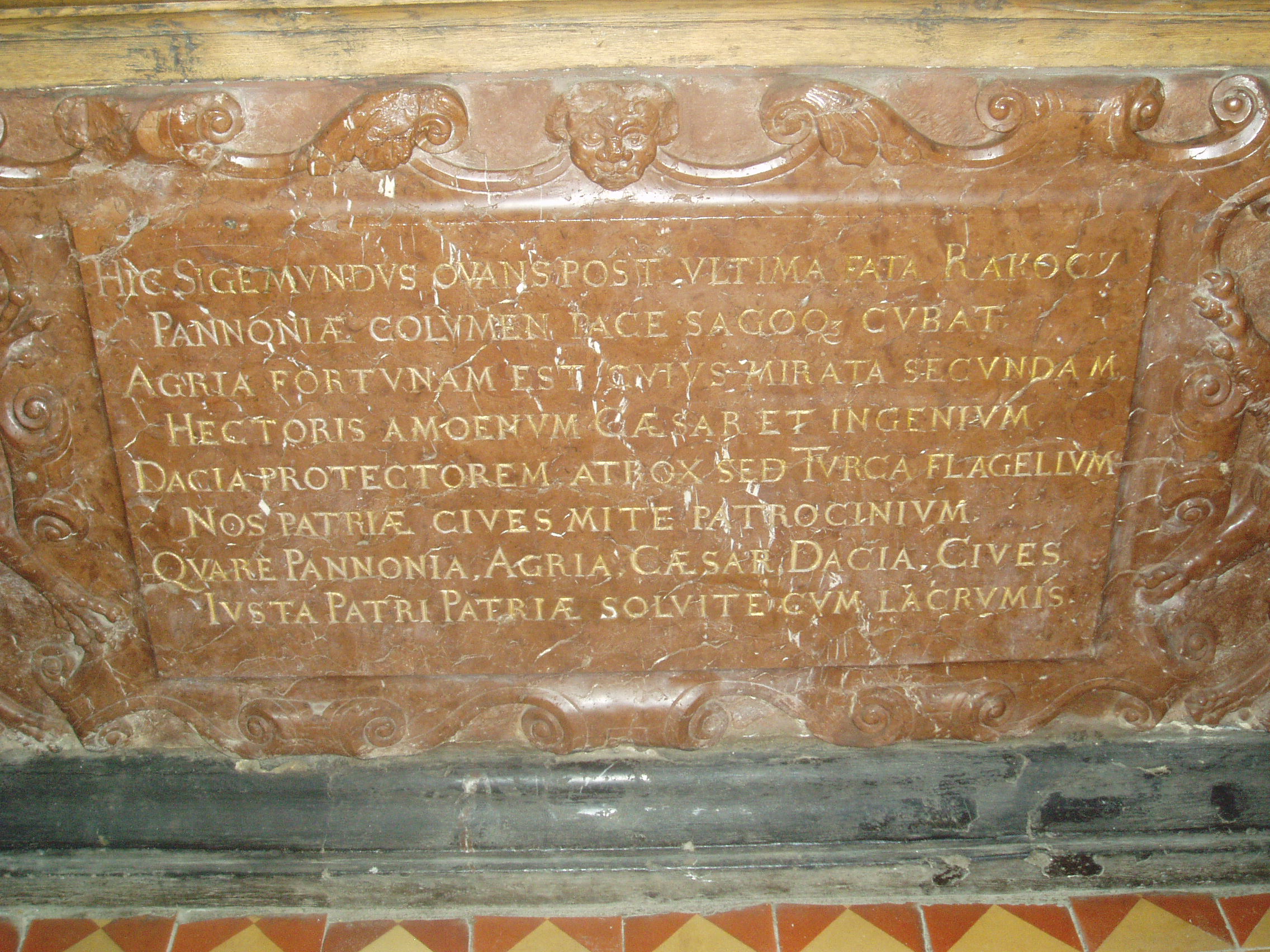 Nyilvános 975 | 1772 | Szerencs, Kossuth tér 4. Református templom - Rákóczi Zsigmond tumbája | Szerencs legrégibb temploma a XIII. században épült eredetileg román stílusban. Az épületet 1480-ban átalakították, ekkor készült a középen álló gótikus torony. Az épületet gótikus támpillérek fogják körül. A templomot 1595-ben adományozta Rákóczi Zsigmond református hittársainak, az ő támogatásával jelentős átalakításokat is végeztek rajta. A templom nemcsak építészetileg nevezetes, hanem jelentős történelmi emlékhely is. 1605-ben az e falak között tartott országgyűlésen választották Bocskai Istvánt Magyarország fejedelmévé. A templom hajójában található Rákóczi Zsigmond (1544-1608) címerrel ékesített vörös márány szarkofágja (tumbája), amelyet 1618-ban a fejedelem három fia, György (1630-tól erdélyi fejedelem), Zsigmond és Pál készíttetett. A síremlék tetején levő latin szöveg fordítása: "Tekintetes és nagyságos felsővadászi Rákóczi Zsigmond, Borsod vármegye főispánja, a magyar király néhai lefőbb tanácsosa, először Szendrő, azután pedig Eger kapitánya és Erdély fejedelme, a magyarországi részek ura és a székelyek ispánja számára állíttatott jeles címer, akinek erénye gyakrabban híresedett el Magyarországon legnagyobb örvendezések közepette. Aki meghalt az ő kegyeletes szülőhelyén, Felsővadászon az 1608. évi december hó 5-én, midőn innen-onnan 64 évig élt. Három gyászoló fia: Rákóczi György , Zsigmond és Pál az ő legkedvesebb édesatyjuknak, aki irántuk és a haza iránt jól érdemesült." A szarkofág nyugati oldalán a következő felirat olvasható: "Tebenned reméltem Uram, hogy nem leszek porrá mindörökké! " A déli oldalon Miskolczi Csulyak István prédikátor verse őrzi Rákóczi Zsigmond emlékét (a képen ez a felirat látható): "Itt nyugszik végső lehelete után a békében és háborúban győzedelmes Rákóczi zsigmond, Magyarország oszlopa, akinek Eger csodálta szerencséjét, a császár fővezérének kies lángelméjét is, Erdély oltalmazóját, a kegyetlen török pedig ostorát, mi honfiak az ő kegyes atyai indulatát. Azért Magyarország, Eger, császár, honfiak, érdemihez illően fizessetek könnyeitekkel a haza atyjának." A síremlék alatt egy deszkaajtó felnyitása után lehet lejutni a kriptába. Ott található a fejedelem földi maradványait őrző urna, amelyet 1849-ben kapott adományul a város a X. zászlóalj tisztikarától. Bár 1644-ben, amikor Esterházy Miklós nádorispán csapatai megrohanták és kifosztották Szerencset, meggyalázták a fejedelem síremlékét is, Rákóczi Zsigmond koponyája megmaradt, s ma a kriptában egy kőurnában őrzik. Bizonyítéknak a koponyán található gyógyult fejsérüléseket tekintik, amelyeket az itt eltemetett személyek közül egyedül a fejedelem kaphatott. 1855. október 19-én járt a templomban, zempléni kirándulásuk alatt Arany János és Tompa Mihály. Arany a következőket írta levélben egy barátjának: "Szerencsen egy Rákóczi korabeli templomban láttuk Rákóczi Zsigmond fejedelem czímeres és feliratos márványravatalát.” A fénykép 2007 augusztusában készült. Felh. irod.: Tájékoztató feliratok a templomban www.szerencs.hu http://tokaj-turizmus.wplanet.hu/irodalmiut |