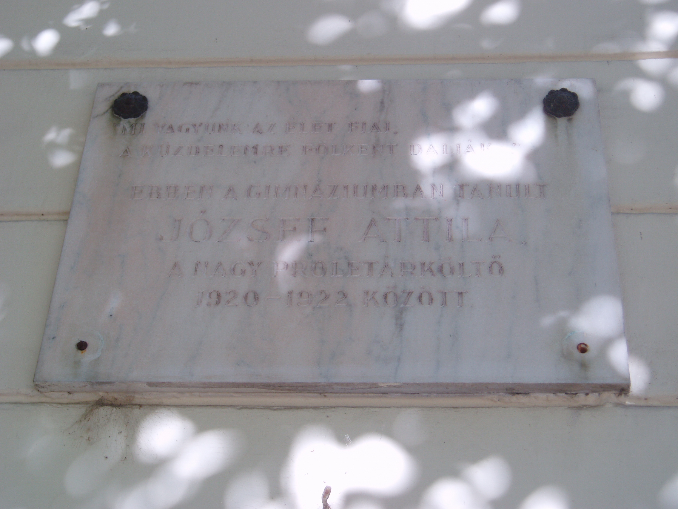 Nyilvános 1021 | 1578 | Makó, Csanád vezér tér 6. József Attila Gimnázium | A város központjából északra nyílik a sugárútszerű Csanád vezér tér. Nyugati oldalán áll a József Attila Gimnázium 1895-ben, eklektikus stílusban, Gerle Lajos tervei alapján emelt épülete. Itt tanított négy évig Juhász Gyula, itt tanult József Attila, majd Erdei Ferenc. A tizenöt és fél éves József Attila 1920 októberében érkezett Makóra. Verseire Juhász Gyula figyelt fel, akinek pártfogása révén a nyugat is közölt néhányat belőlük. Makói diák volt, amikor tizenhét éves korában Szegeden megjelent első verseskötete, a "Szépség koldusa", Juhász Gyula prófétikus előszavával: "A legnagyobb készséggel és örömmel vállalkoztam arra, hogy József Attila első verses könyvéhez előszót írjak. Ez a nagyon fiatal és nagyon tehetséges költő a legteljesebb mértékben megérdemli, hogy a figyelem feléje forduljon, hogy igaz szeretettel és reménységgel fogadja a magyar olvasóközönség és hogy a kritika se menjen el mellette közömbösen vagy ellenségesen és ne elégedjék meg vele szemben a nyomtatásban megjelenőknek rendesen kijáró vállveregetéssel. József Attila Isten kegyelméből való költő." Az épület előtt áll 2005-ben, születése centenáriumán újjáavatott szobra, a járdába ágyazottan pedig első verseskötetének bronzba öntött címlapja idézi emlékét. A fénykép 2007 júliusában készült. Felh. irod.: Barangolások Csongrád megyében. Miskolc, Well-PRess, 1997 |