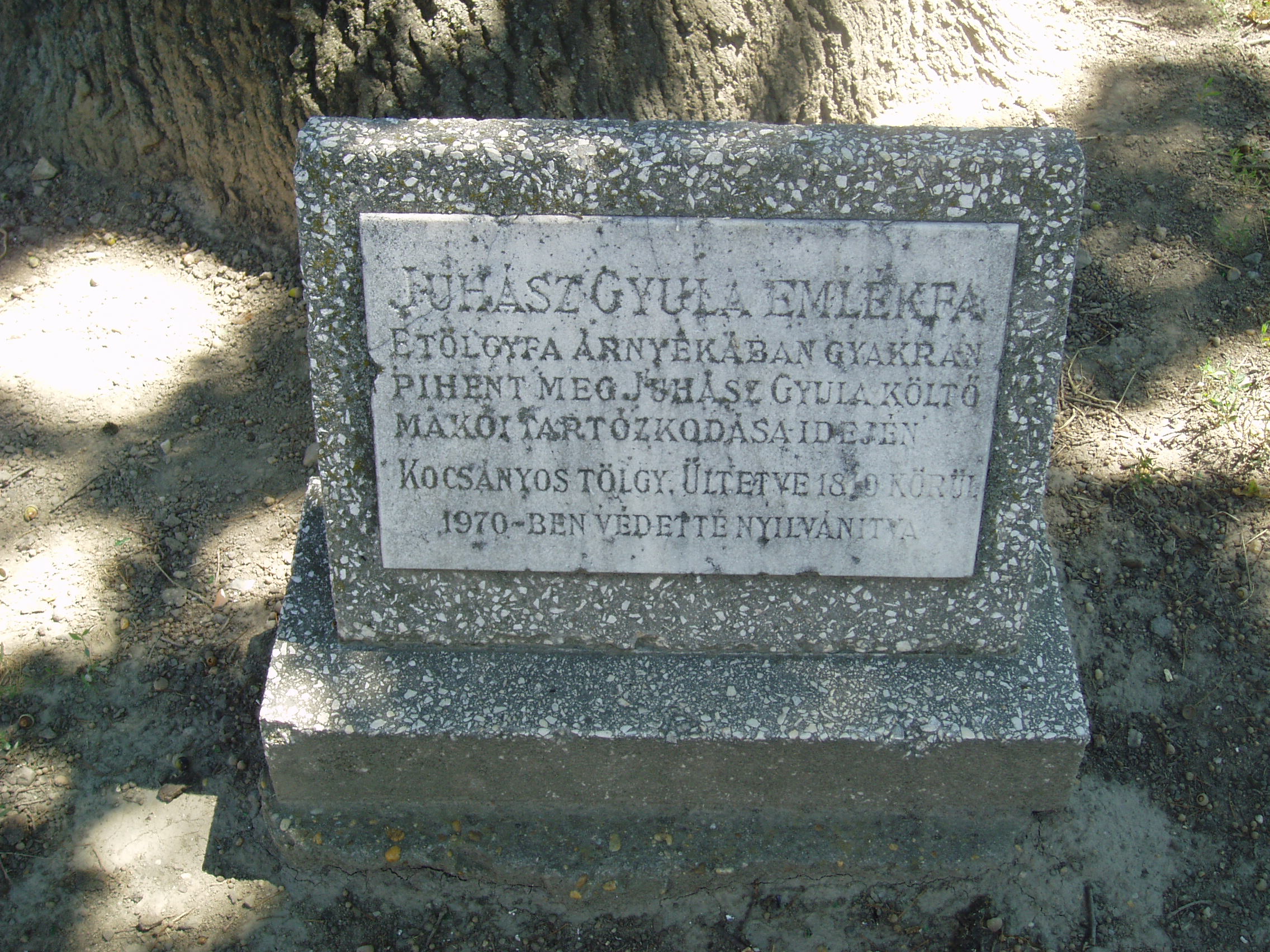 Nyilvános 1020 | 1505 | Makó, Megyeház utca 16. Juhász Gyula-emlékfa | A Megyeház utca 16. számú ház előtti kis parkban áll a Juhász Gyula-emlékfa. A másfél méter törzsátmérőjű kocsányos tölgyet az 1810-es években ültették. Juhász Gyula gyakran kereste fel makói tartózkodása idején. A fénykép 2007 júliusában készült. Felh. irod.: Barangolások Csongrád megyében. Miskolc, Well-PRess, 1997 |
