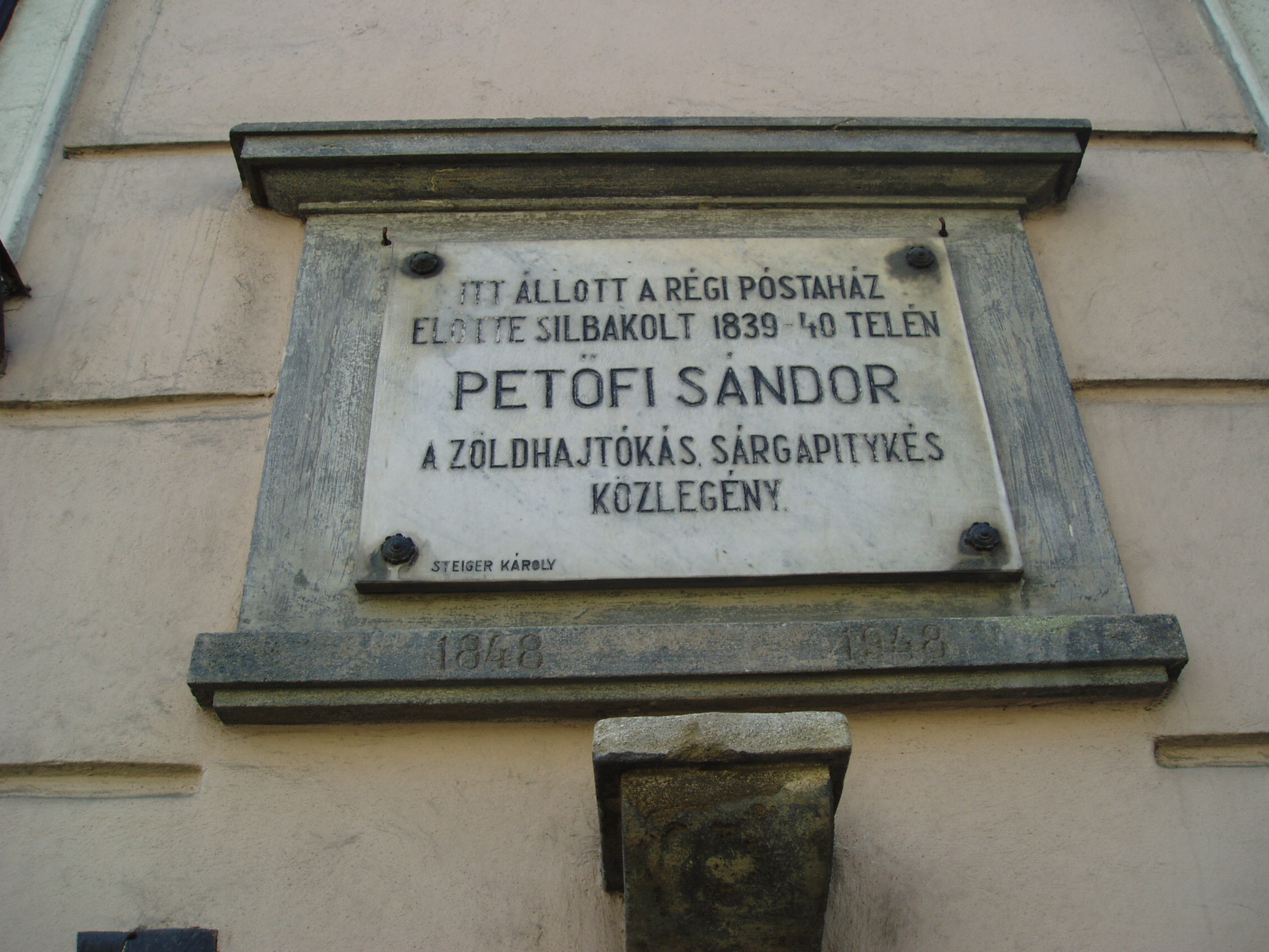 Nyilvános 1072 | 1817 | Sopron, Széchenyi tér 14. | Az épületen Petőfi Sándor emléktáblája olvasható azon a helyen, ahol a régi postaház előtt katona korában őrségben szokott állni. Petőfi 1839. szeptember 6-án hirtelen elhatározással belépett a báró goldnerfalvi Gollner Alajos tulajdonában lévő gyalogezredbe, és hat évi szerződést írt alá. A költő a zöldhajtókás, sárga pitykés, frakkszabású egyenruhát rövid ideig hordta. Betegsége miatt 1841. februárban felmentették a szolgálat alól, és obsittal elbocsátották, majd 1841. március elején elhagyta a várost. Ma e hely közelében szobra is áll. A fénykép 2006 áprilisában készült. Felh. irod.: Czellár Katalin: Sopron. Bp. Panoráma, 1988 |