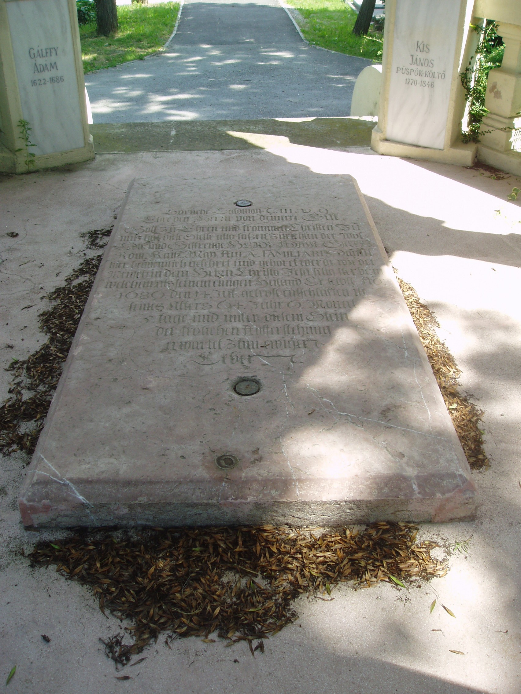 Nyilvános 1072 | 1762 | Sopron, Balfi út. Evangélikus temető. Gálffy Ádám sírboltja | A soproni evangélikusok 1674-ben nyitották meg temetőjüket, korábban a katolikusokkal együtt a Szent Mihály temetőbe temetkeztek. Az 1686-ban elhunyt Gálffy Ádám mellett ide temették az evangélikus egyház nevesebb lelkészeit is: a történetíró Gamauf Teofilt és Kis János költőt. A sírbolt egy hatszögletes, nyitott csarnok, amelyet kőkorlát szegélyez, ezen oszlopok emelkednek. Az építményt cseréptető fedi. Padlójában,amelyhez néhány lépcsőfok vezet, Gálffy epitáfiuma látható. Gálffy Ádám gazdag soproni polgár, földbirtokos, kereskedő volt, aki nagyértékű kegyszergyűjteményt ajándékozott az evangélikus gyülekezetnek. A fénykép 2008 júniusában készült. Felh. irod.: Czellár Katalin: Sopron. 3. jav. kiad. Bp. Panoráma, 2000 |