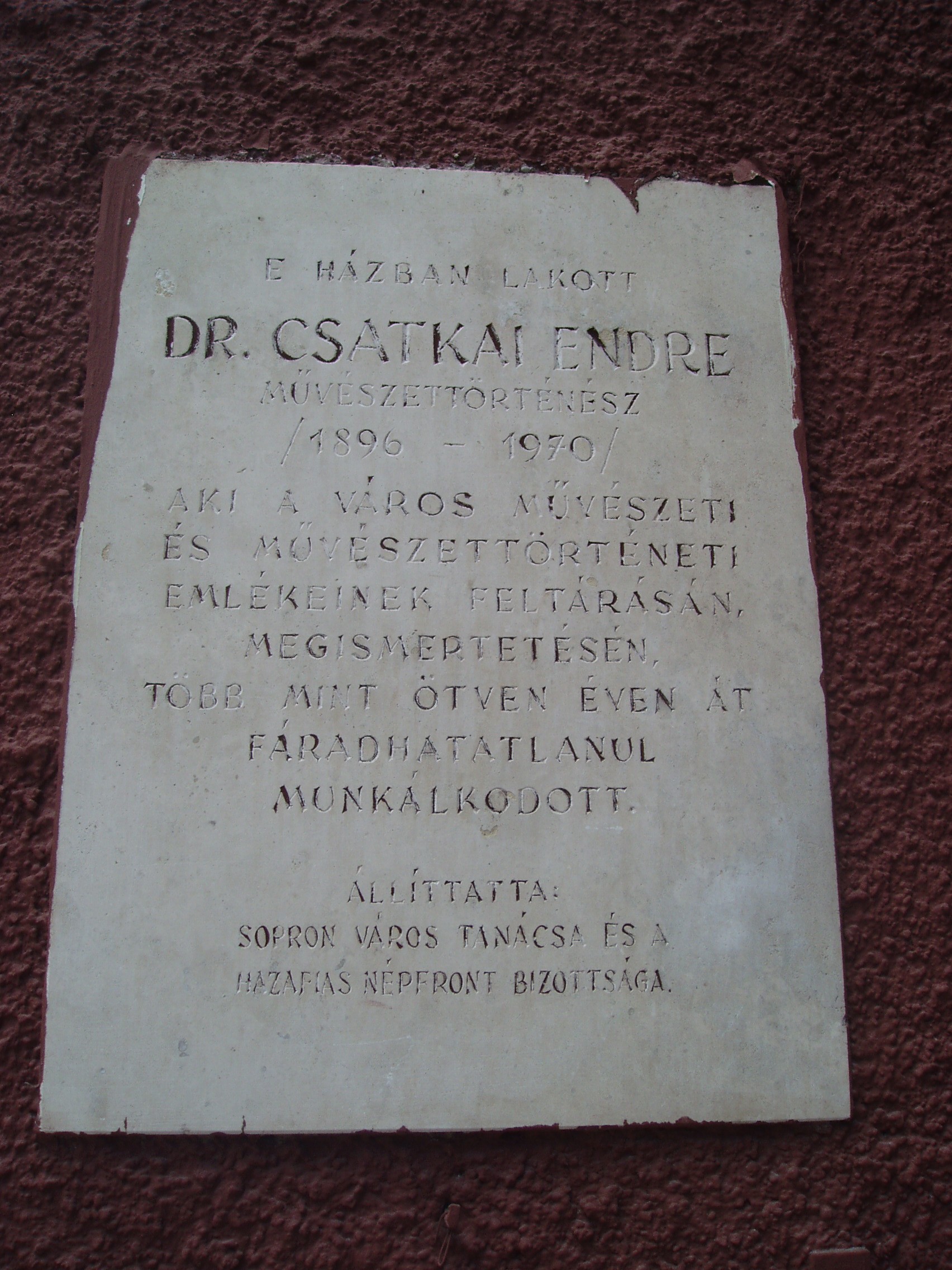 Nyilvános 1044 | 1553 | Sopron, Előkapu 10. | Sopron belvárosának főbejárata az északon nyíló Előkapu. Helye már a római korban lakott volt, majd a középkorban erődítésrendszert alakítottak itt ki. A területet a XVIII. század közepétől kezdték beépíteni lakóházakkal. Az itt álló, fűrészfogasan kialakított lakóépületek az egykori erődítés vonalát követik. Mint emléktáblája is tanúsítja, ebben a házban élt Csatkai Endre (1896-1970) művészettörténész, aki Sopron művészeti és művészettörténeti emlékeinek feltárásán, megismertetésén több, mint ötven éven át munkálkodott. Neve és munkássága megkerülhetetlen a Sopronnal ismerkedőknek. A fénykép 2008 júniusában készült. Felh. irod.: Czellár Katalin: Sopron. 3. jav. kiad. Bp. Panoráma, 2000 |