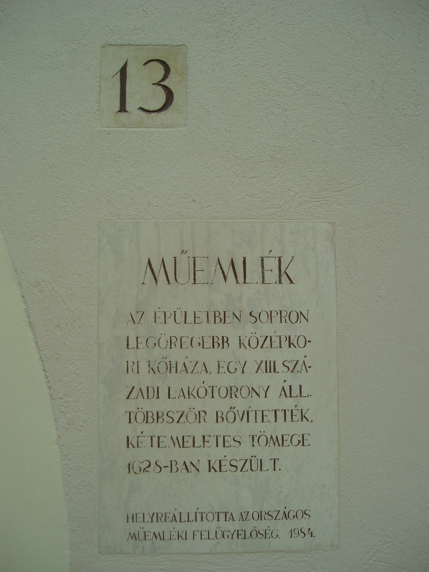 Nyilvános 955 | 1374 | Sopron, Kolostor utca 13. | A lakóház Sopron eddig ismert legkorábbi világi kőépületének fennmaradt részeit őrzi: egy XIII. századi lakótornyot. A középkorban a mai Kolostor utca 13. és az Új utca 16. egy telek volt, s amikor a lakótornyos beépítést a harántházas váltotta fel, jómódú tulajdonosa a telek végében reprezentatív termet készíttetett. Ennek három szép gótikus ablakát az Új utca 16. számú épületen láthatjuk. 1628-ban az épületet kibővítették, majd kétemeletes formában épült újjá. Homlokzata egyszerű, követi az utca vonalát. A lakótoronyból megmaradt az alsó szint, a későromán keresztboltozat maradványa s egy alacsony emeleti ajtó. A mai épület kis udvarán festői szabad lépcső visz az emeletre, ahol egy toszkán oszlopos, pilléres, keresztboltozatú loggia van, fölötte zárt erkéllyel. A fénykép 2008 júniusában készült. Felh. irod.: Czellár Katalin: Sopron. 3. jav. kiad. Bp. Panoráma, 2000 |