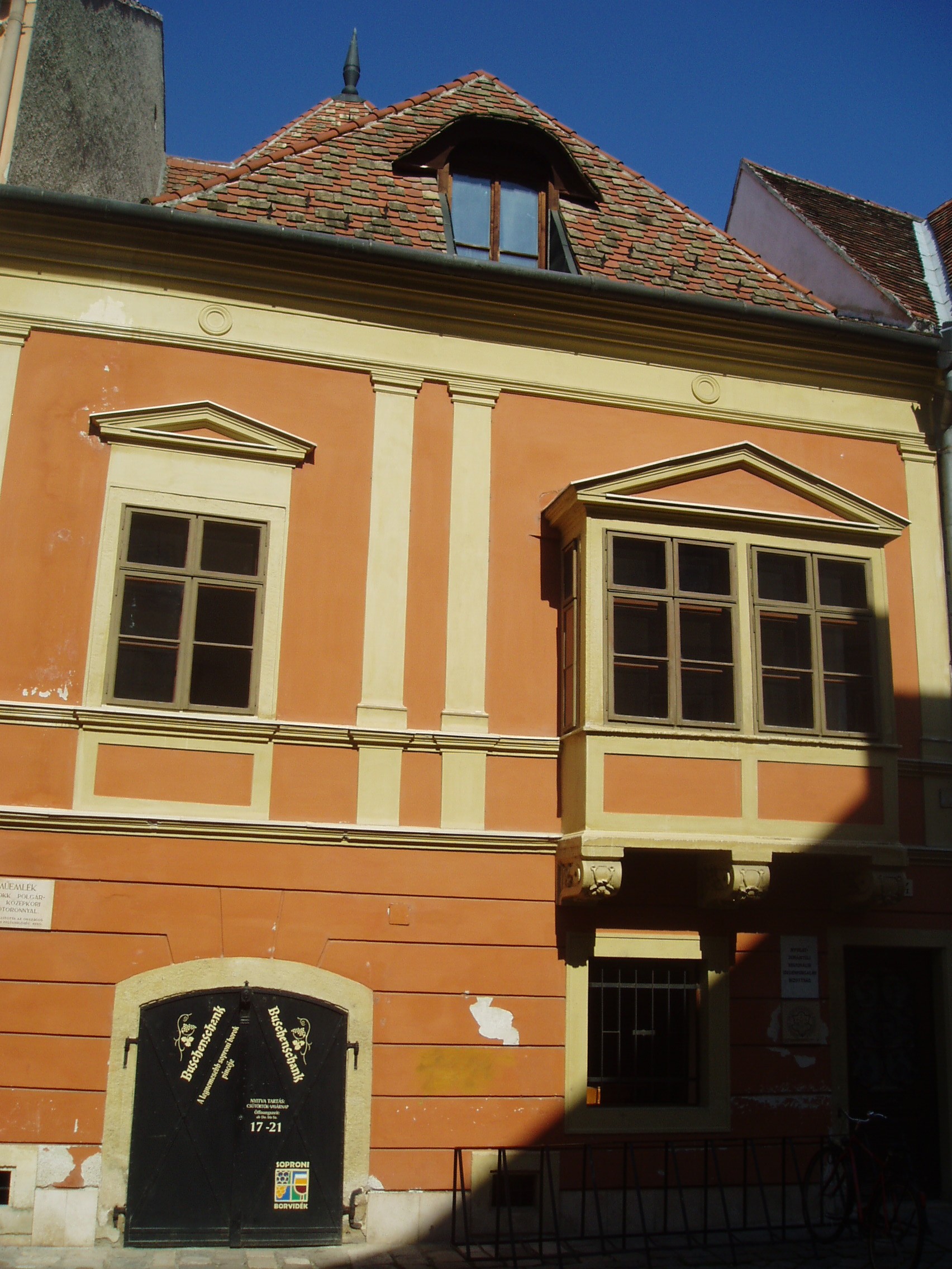 Nyilvános 1005 | 1329 | Sopron, Új utca 4. | Az egyemeletes lakóház középkori eredetű. Falai lakótorony maradványait rejtik. Zárt erkélye a XVII. századból származik, de homlokzatának többi részét a XIX. században átalakították. A kép 2008 júniusában készült. Felh. irod.: Czellár Katalin: Sopron. 3. jav. kiad. Bp. Panoráma, 2000 |