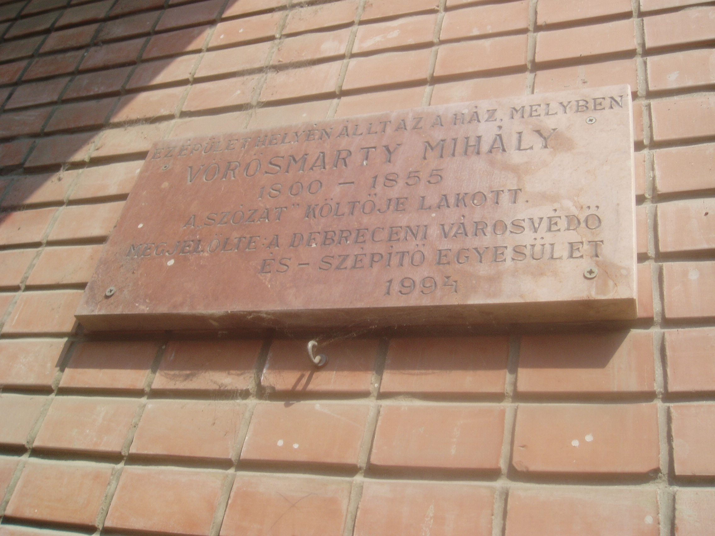 Nyilvános 1395 | 3089 | Debrecen, Csapó utca 16. | Ezen a helyen a középkorban nemesi udvarházak álltak. A helyükre épült - azóta szintén lebontott - egyik házban, a mai 16. házszám alatt lelt otthonra 1849-ben Vörösmarty Mihály (1849 január elejétől kb. fél évig, Buda visszafoglalásáig Debrecen volt a szabadságharc fővárosa). Férje hadbavonulása után ide költözött ideiglenesen Szendrey Júlia is, csecsemő fiával, Petőfi Zoltánnal. Mint Debrecen történelmének egy kutatója megjegyezte, a Csapó utca ebben az időben méltán viselhette volna a "Költők utcája" elnevezést, mert lakott benne Jókai Mór, Vas Gereben és Wachott Sándor is. A mostani házon Vörösmartyra feliratos márványtábla emlékezik. A fénykép 2006 júniusában készült. Felh. irod.: Papp Antal: Debrecen. Bp. Panoráma, 1976 |