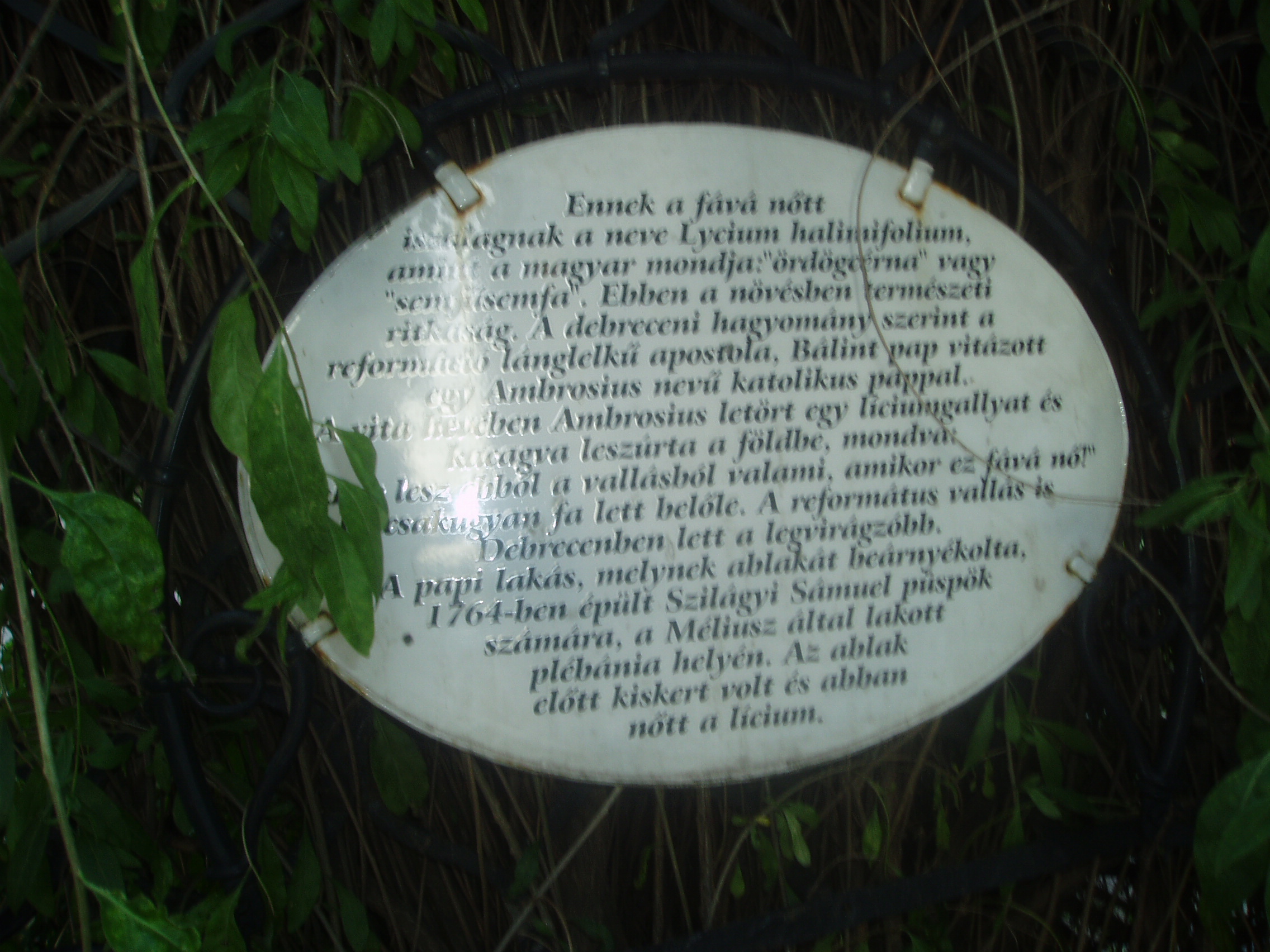 Nyilvános 1053 | 1564 | Debrecen, Hatvan utca 1. Líciumfa | A Nagytemplom háta mögött zöldellő Emlékkert nyugati oldalánál található a fává nőtt líciumtő (semfű-semfa, hivatalos nevén lycium halimofolium). A növény ebben az alakjában botanikai ritkaság, mert általában bokorként, cserjeként ismeretes. A líciumfához egy sokat emlegetett művelődéstörténeti anekdota fűződik (aminek a botanikusok szerint nincs valós alapja): A XVI. században Debrecen városának a reformáció útjára való áttérését megindító Bálint pap a katolikus Ambrosius mesterrel heves vitában sétált itt, az egykori öreg plébánia előtti úton. Kezében egy letört líciumágat tartott és azzal gesztikulált, hogy nagyobb nyomatékot adjon szavainak. Ambrosius mester makacsul hangoztatta, hogy sohasem lesz vallás abból, amit Kálvin tanít. "Akkor lesz ebből vallás - kiáltotta indulatosan -, mikor a lycium fává nő." "Hát akkor fa lesz belőle!" - válaszolta Bálint pap, és lábai előtt a földbe szúrta a líciumágat. S az igénytelen kis gallyacska megfogant s fává terebélyesedett, ágaival befonta a plébánia vasrácsos ablakrostélyát. Mikor évszázadok múlva sor került az öreg épület lebontására, a legendává nőtt líciumfát az ablakrostéllyal együtt érintetlenül hagyták, s ma is ebben az állapotában látható. A fénykép 2006 júniusában készült. Felh. irod.: Papp Antal: Debrecen. Bp. Panoráma, 1976 Kovács Gergelyné: Debrecen. Bp. Panoráma, 1981 |
