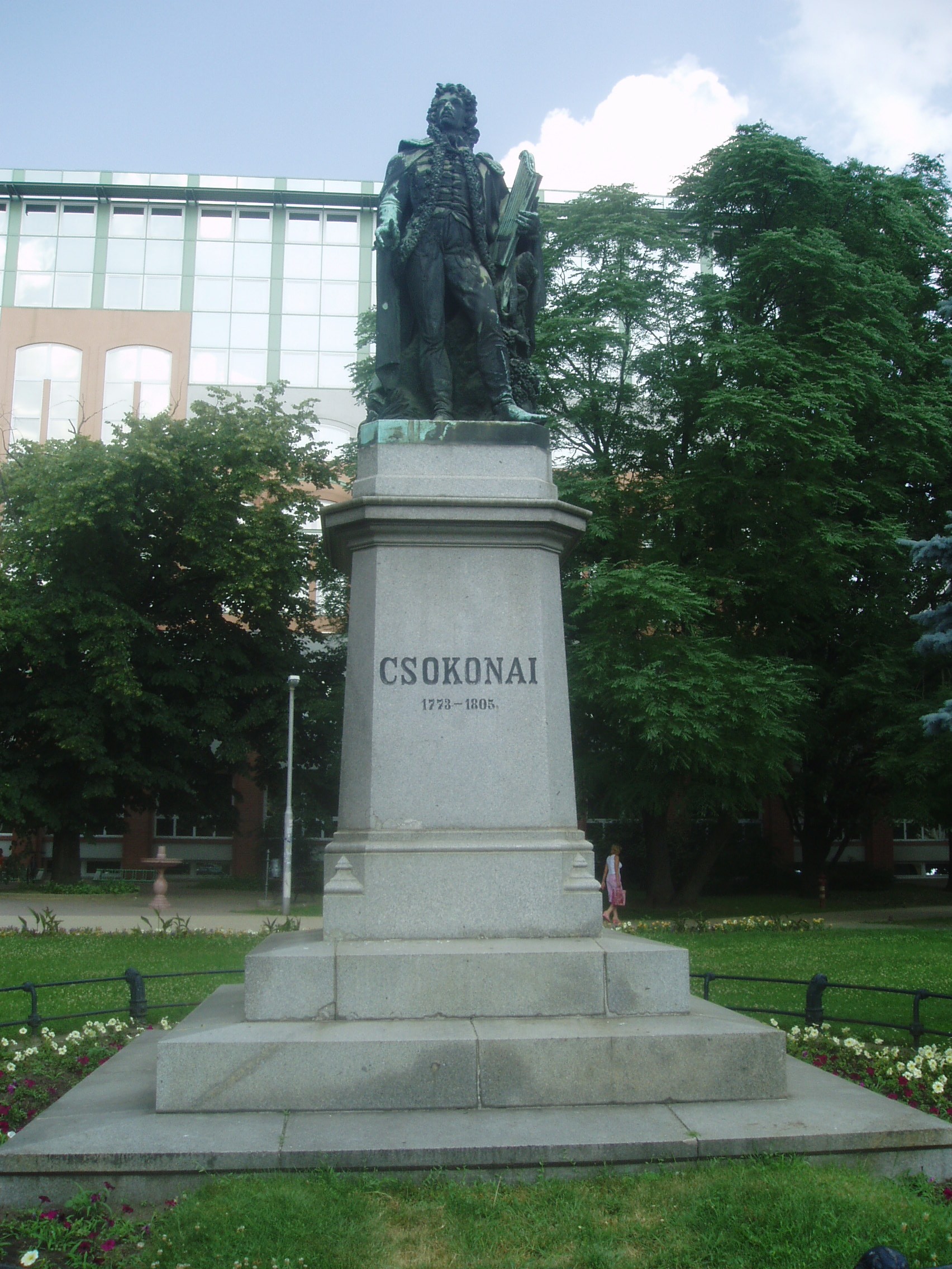 Nyilvános 1194 | 2055 | Debrecen, Kálvin tér: Csokonai Vitéz Mihály szobra | A Kálvin tér ékessége Izsó Miklós Csokonai Vitéz Mihályt ábrázoló, 1867-ben készült romantikus szobra. A magas márvány talapzaton álló és arccal a Kollégium felé tekintő szobor szakértői vélemények szerint az egyik legszebb köztéri szobor Magyarországon. A szobor magyaros ruhában, zsinóros mentében, lanttal a kezében, szőlőtőke mellett jeleníti meg az anakreoni dalok költőjét, mintegy az ihlet pillanatában. A művész eredetileg vékonyabb testalkatúnak mintázta Csokonait (ez a gipszvázlat a Kollégiumban található), de a terv nem nyerte el a debreceni cívisek tetszését, mondván, hogy ilyen sovány ember nem élhetett Debrecenben... A fénykép 2006 júniusában készült. Felh. irod.: Papp Antal: Debrecen. Bp. Panoráma, 1976 Kovács Gergelyné: Debrecen. Bp. Panoráma, 1981 |